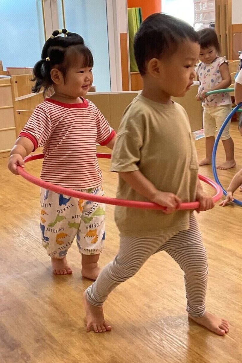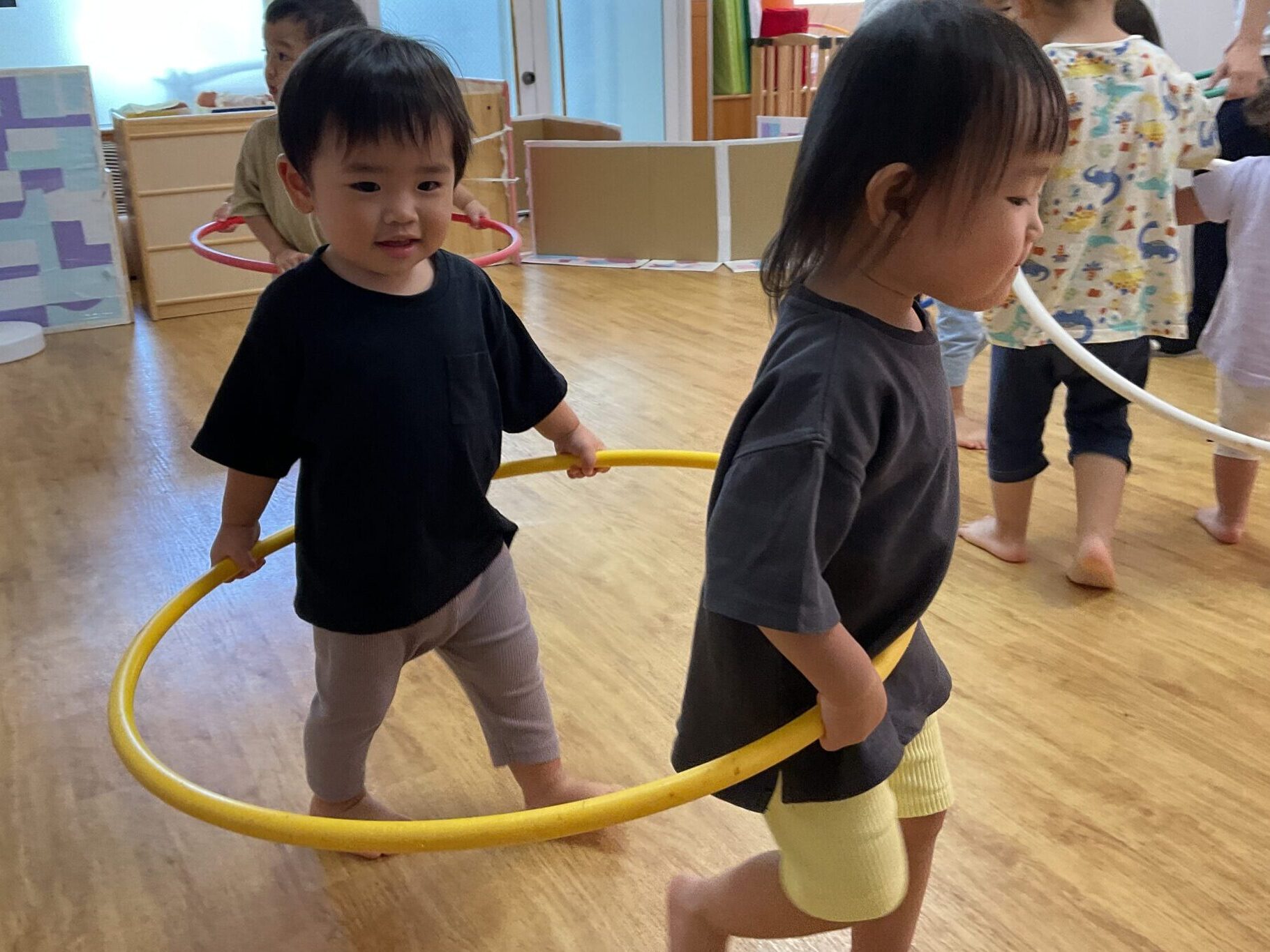 「がったんごっとんバス~がったんごっとんバス~はしります プップ~♪」と歌いながら、フープ電車で走りました。友達と「プップ~♪」と言いながら、走る電車は笑顔いっぱいです。