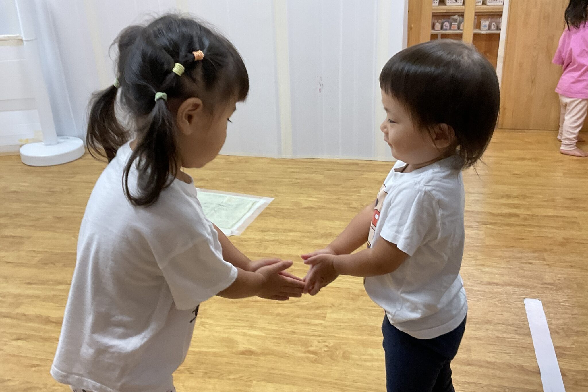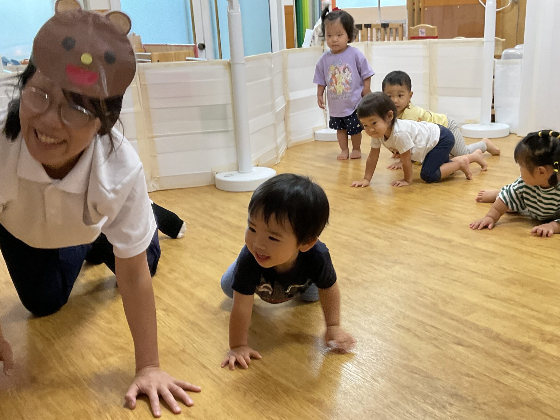 「せんろはつづくよ どこまでも」の曲に合わせて、子ども達が長い電車になって繋がったり、「もりのくまさん」の曲でハイハイをしたり、全身を使って体を動かすだけでなく、お友達や保育者との関わりも楽しんでいます。