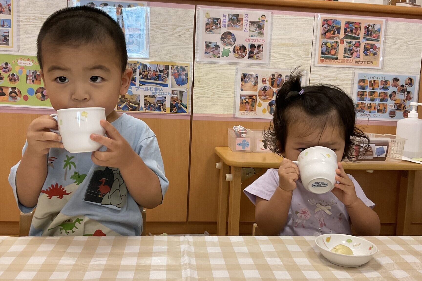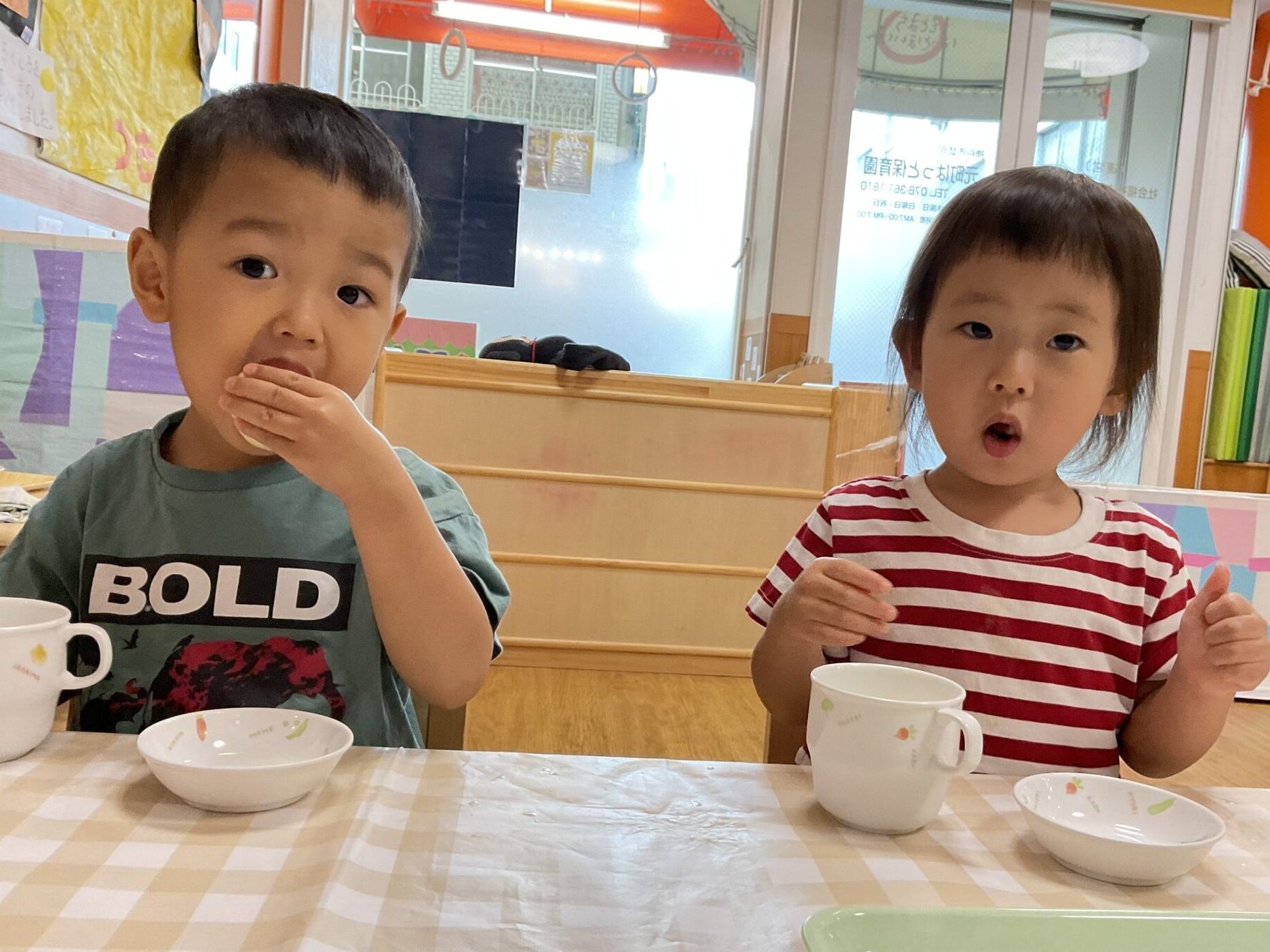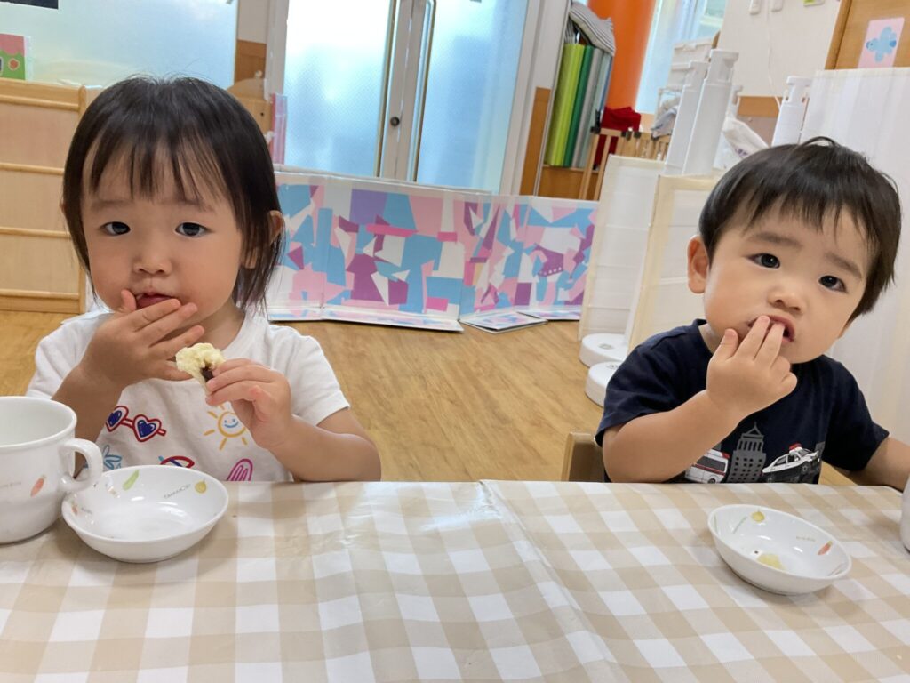 お昼寝をしていると良いにおいが…! 元町はっと保育園のお部屋に美味しいにおいが広がっています。毎日幸せそうな表情でおやつを食べていますよ。