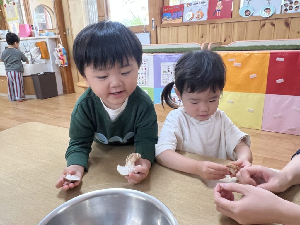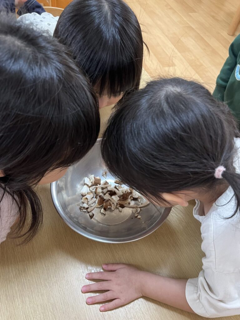 「くさいにおいがするね」「おいしそ~う」「きのこのにおいがする」と言いながら