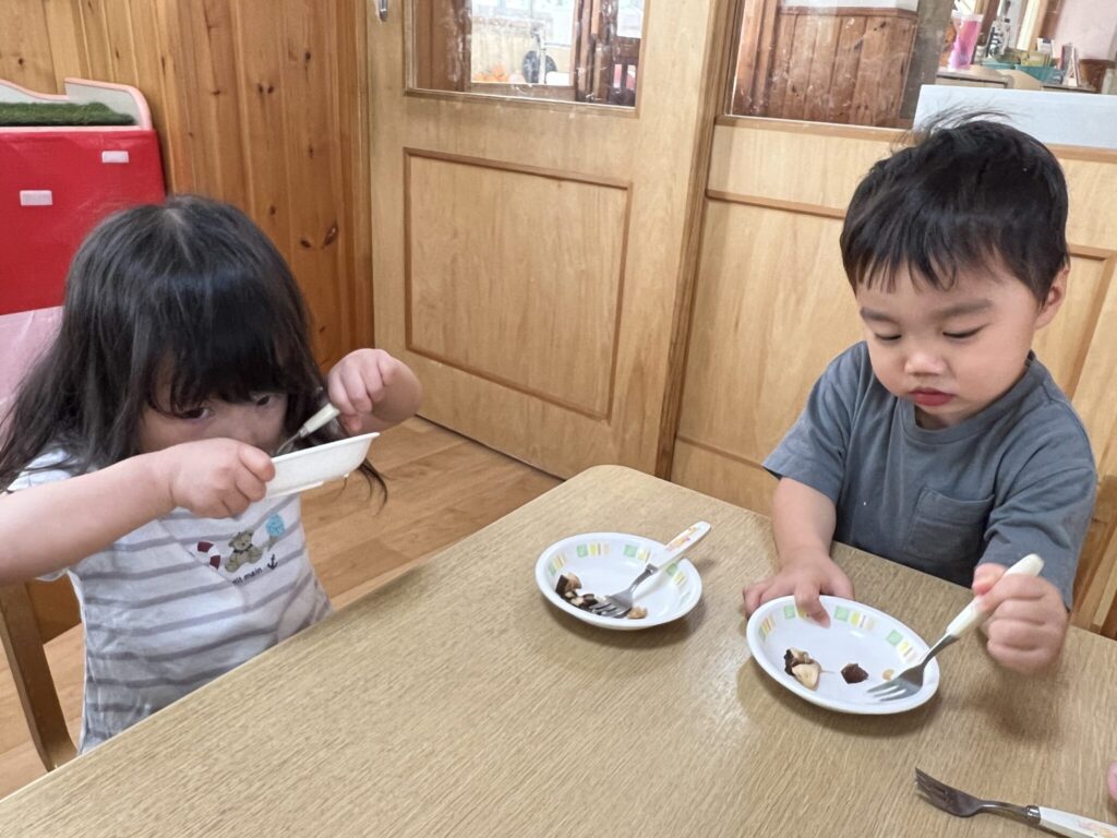 早く食べたい気持ちがいっぱいのあひる組の子ども達!