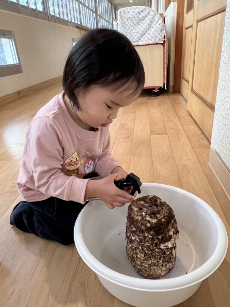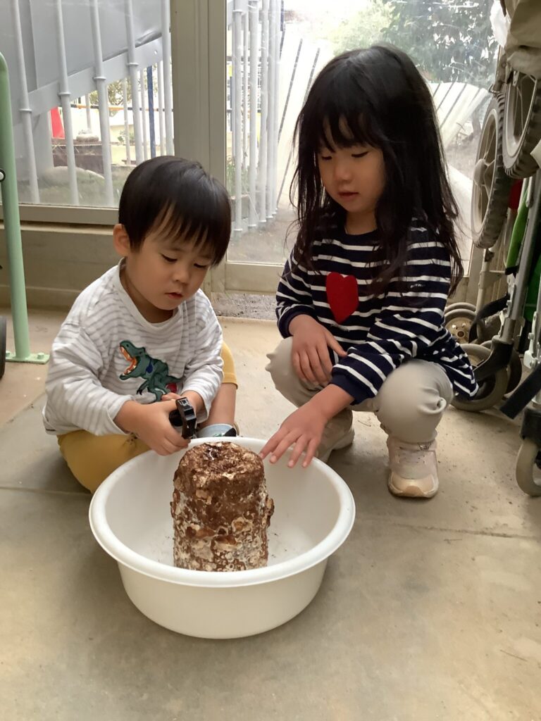あひる組(2歳児クラス)でしいたけを育てました。
