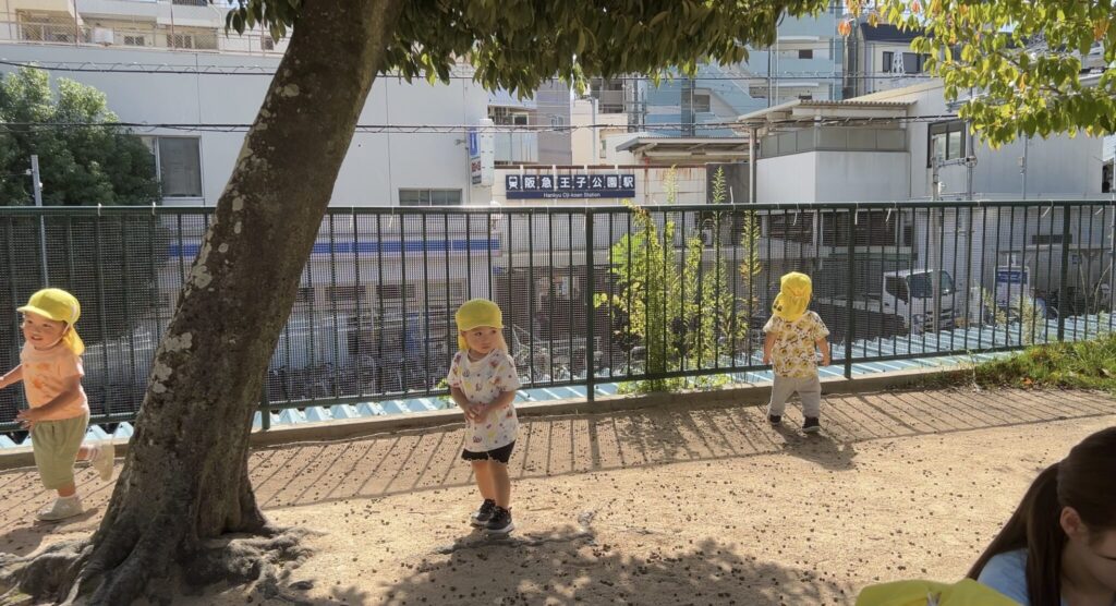 広い公園でたくさん走ったり、時々走る阪急電車を見たり楽しみました。