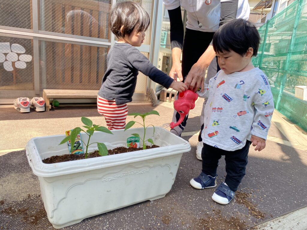 最後に、ぞうさんのジョウロでお水やりをしました。「もう一回、お水入れて」とお水やりが一番楽しかったようです。ピーマンが育ったら、子どもたちとクッキングをして食べる予定です。