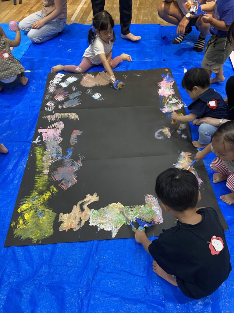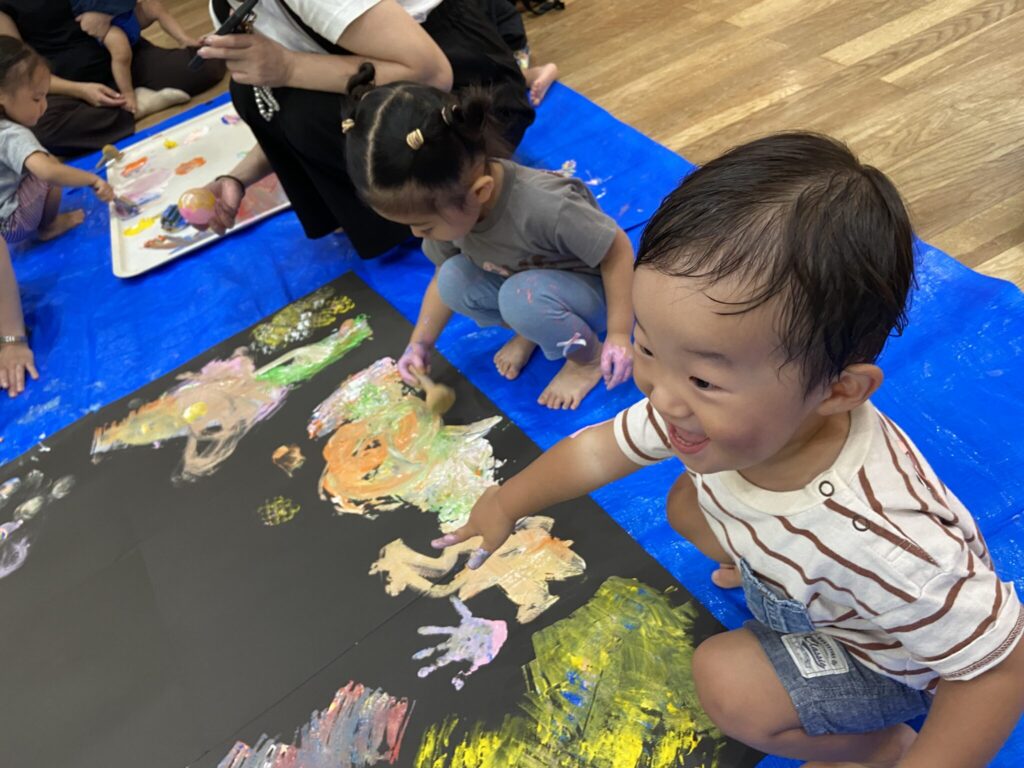 9月18日(木)のわんぱく広場で絵の具遊びをしました。画用紙や段ボールに筆やスポンジ、風船を使って描いたり、色の混ざりを見たり、絵の具を触って感触を楽しみました♪
