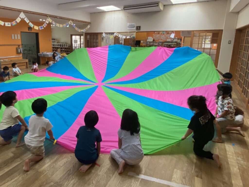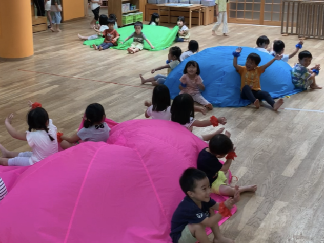 4歳児は去年憧れていた大きなパラバルーンに挑戦!いつも元気いっぱいのあさがお組ですが、取り組みをするにつれてみんなで力を合わせて静かにカッコよくできるようになっていきました✨