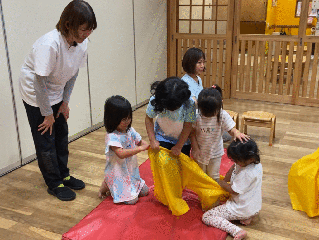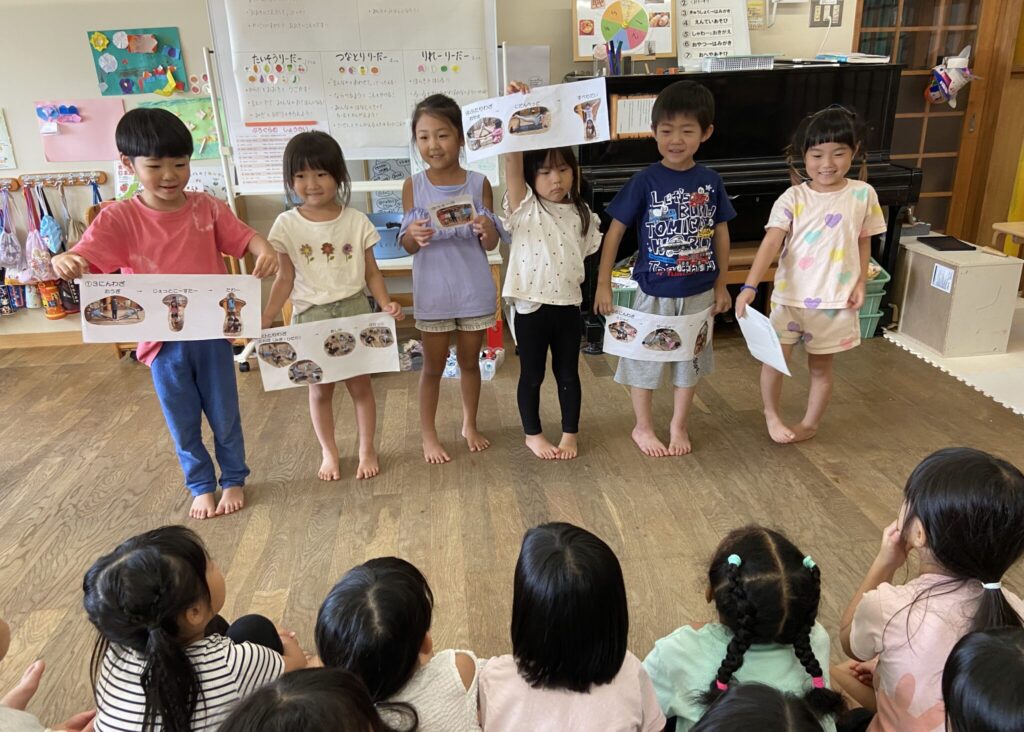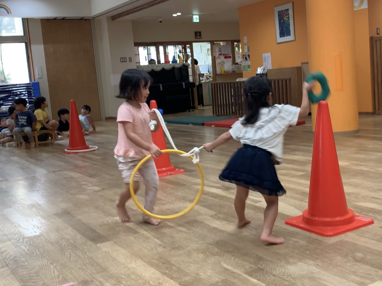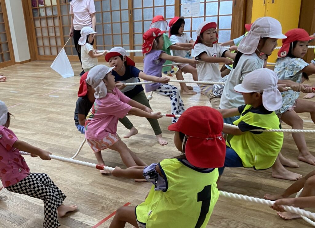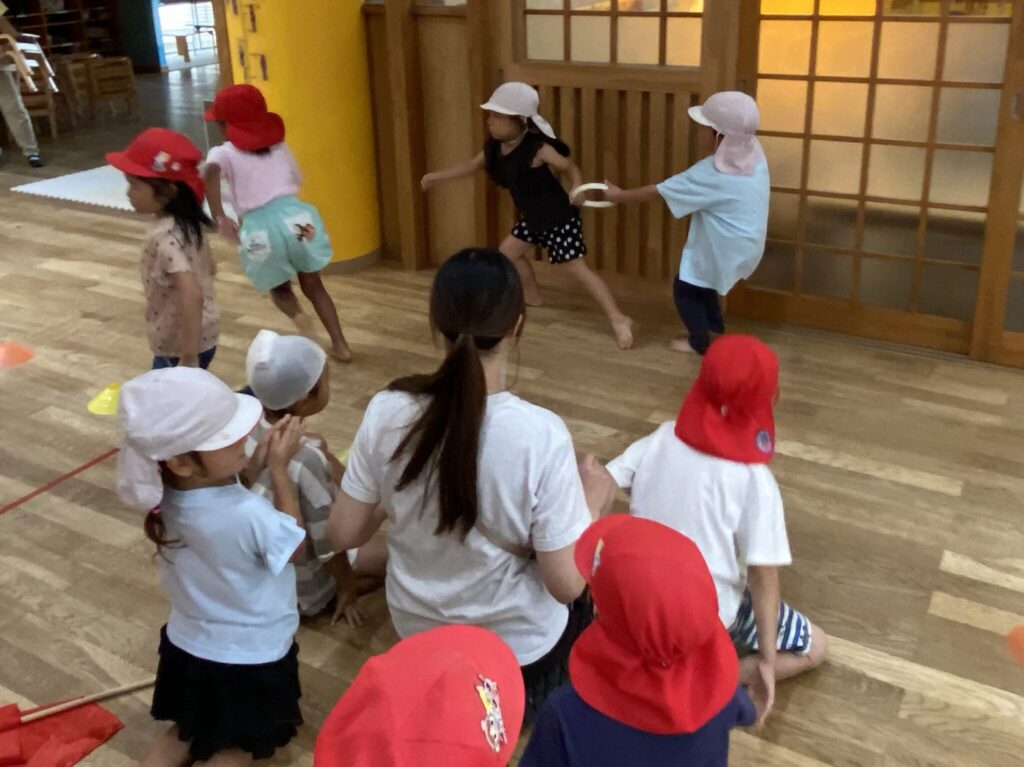 競技も初めは2人でデカパンを履いたり一緒に進むのに苦戦していましたが、少しずつ競争心をもってチームで力を合わせてできるようになってきました。本番は今までの取り組みの中で勝ったことがなかったチームが勝ち、子どもたちの取り組みの成果が見られた瞬間でした😊