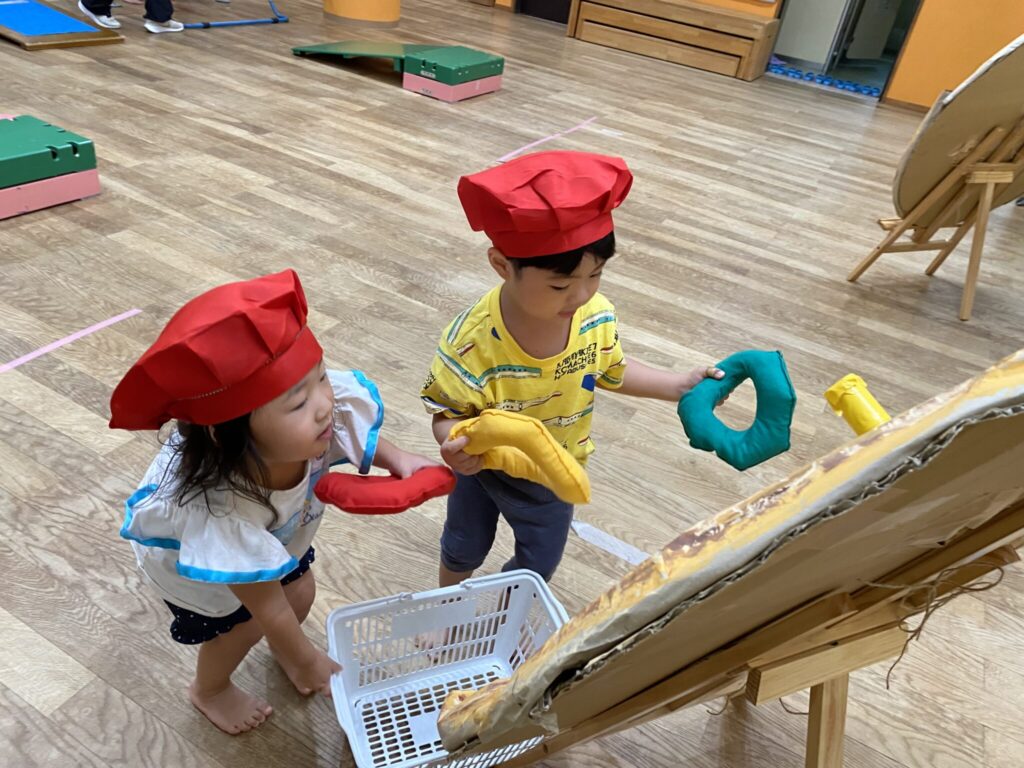 2歳児は初めての運動会。かけっこに加え、競技ではピザ屋さんになって2人で力を合わせてピザをつくりました。少しずつあそびの延長のような形で取り組みを重ねていましたが、取り組みのときからみんな楽しく行っていました😊