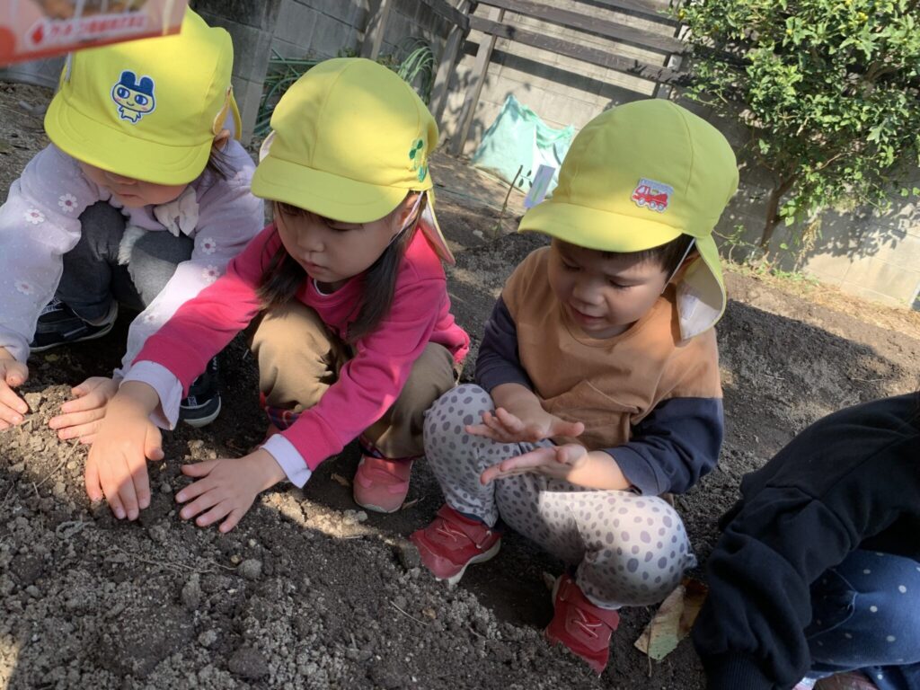 その後、畑にカブの種を植えました。種を観察すると赤茶のような色で小さい種なのか驚き「ちいさい!」「おとしそう!」と話す子ども達。保育者が植え方を伝えると慎重になりながらも「ふわふわのふとん(土)をかけてあげるね」と優しく声を掛けながら植えました!