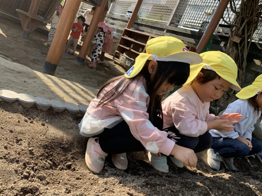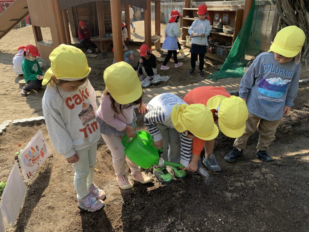 優しく土をかけた後は水やりをしました。「おおきくなるかな?」「はやく芽がでてほしい…」と話しながらもグループの友だちで協力しながら水やりをしています。