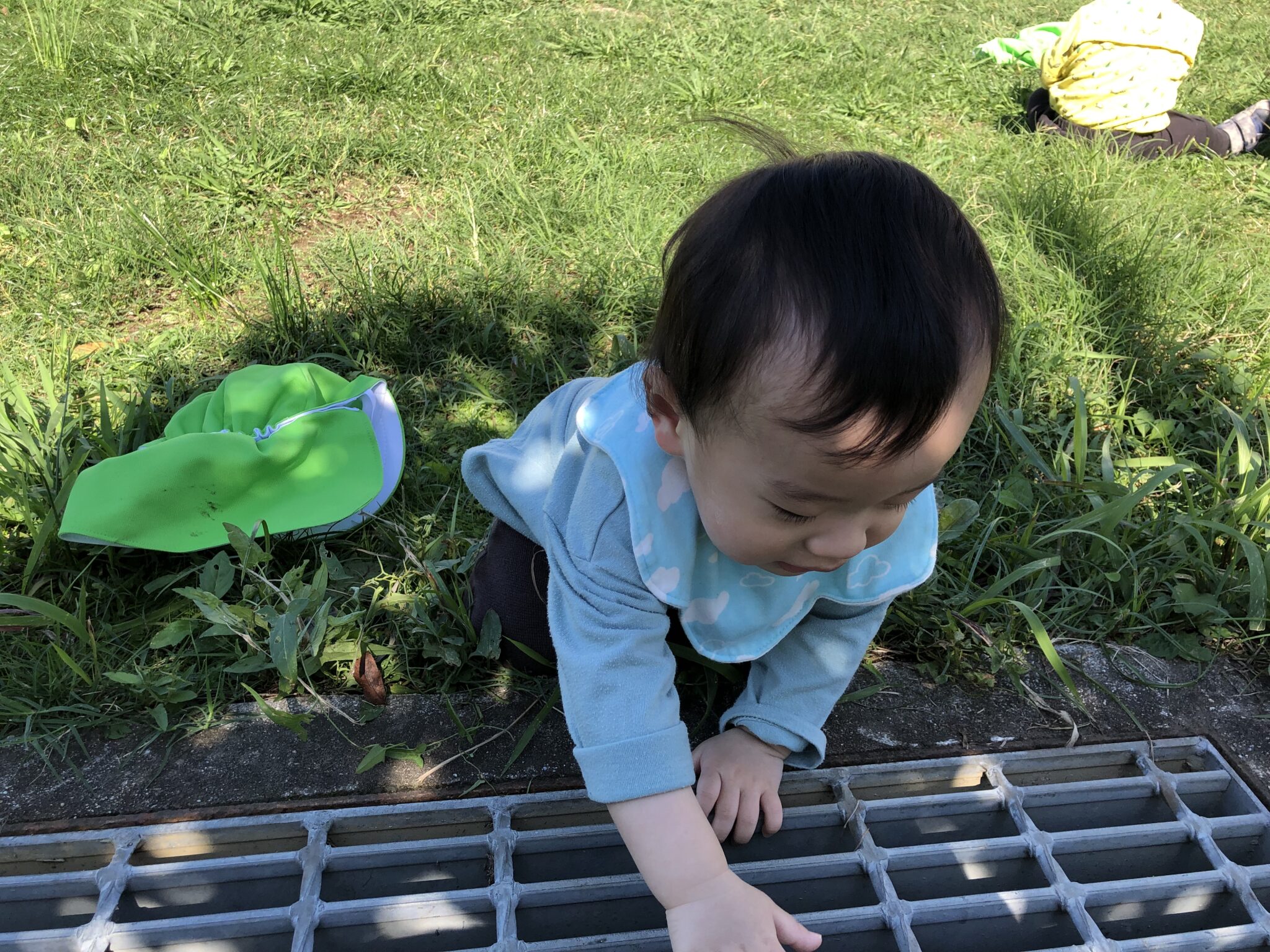 この下に水が溜まっていて、水面に顔が映るのでこの場所が大好きな子どもたちは「おーい!」と手を振ったり「何で映るの?」と不思議そうにのぞき込んだり、石や葉っぱを入れて水がはじく音を楽しんでいます😊