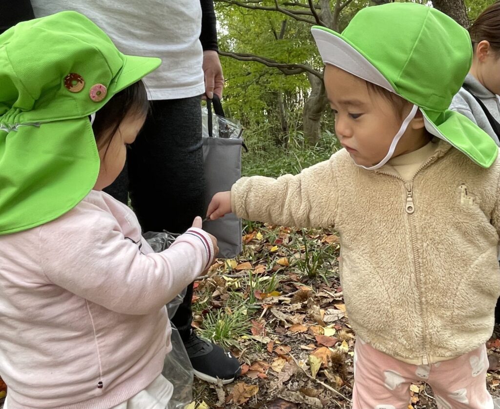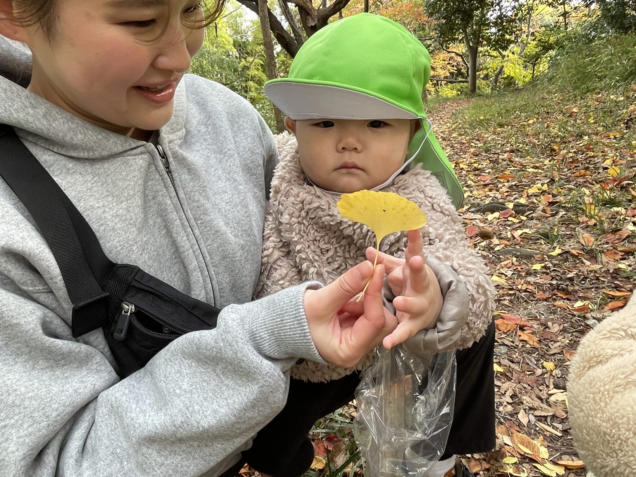 秋の自然物、いちょうやどんぐりなどを一緒に拾いに行きました🍁園庭にはない自然物ばかりで、見つけたお気に入りの自然物をたくさん袋に入れ、帰るまで大事に持っていました😌拾ったどんぐりや落ち葉、木の枝などは制作に使いたいと考えています。