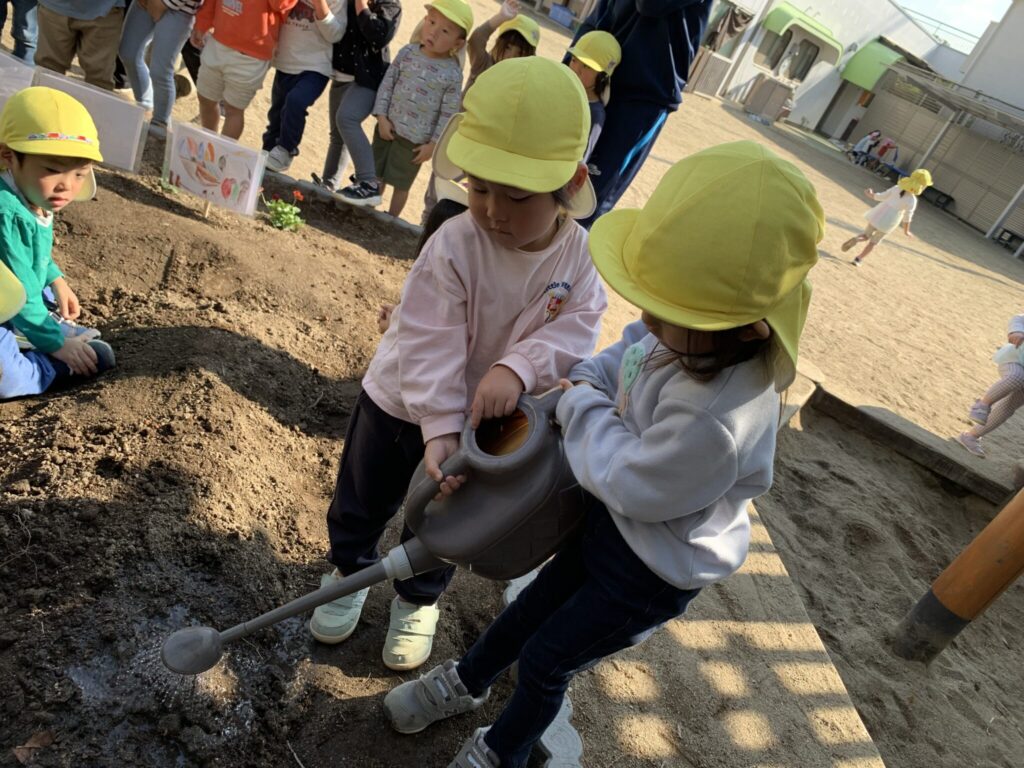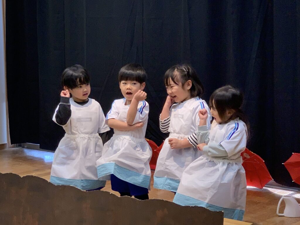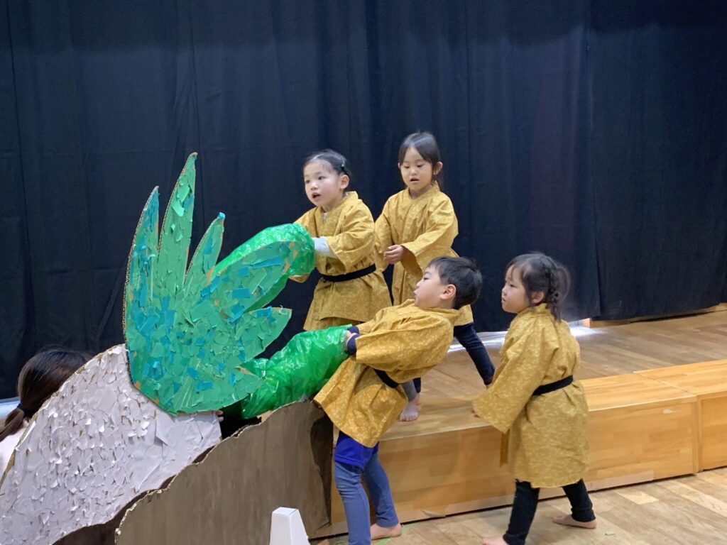 劇は、子ども達が大事に育てているカブを題材にした「大きなカブ」をしました。子ども達は、カブを植えた時から「おおきくなーれ」と何度も口ずさみながらお水をあげる姿がありました。「大きなカブ」の歌を歌いながらカブの様子を観察していました🌱