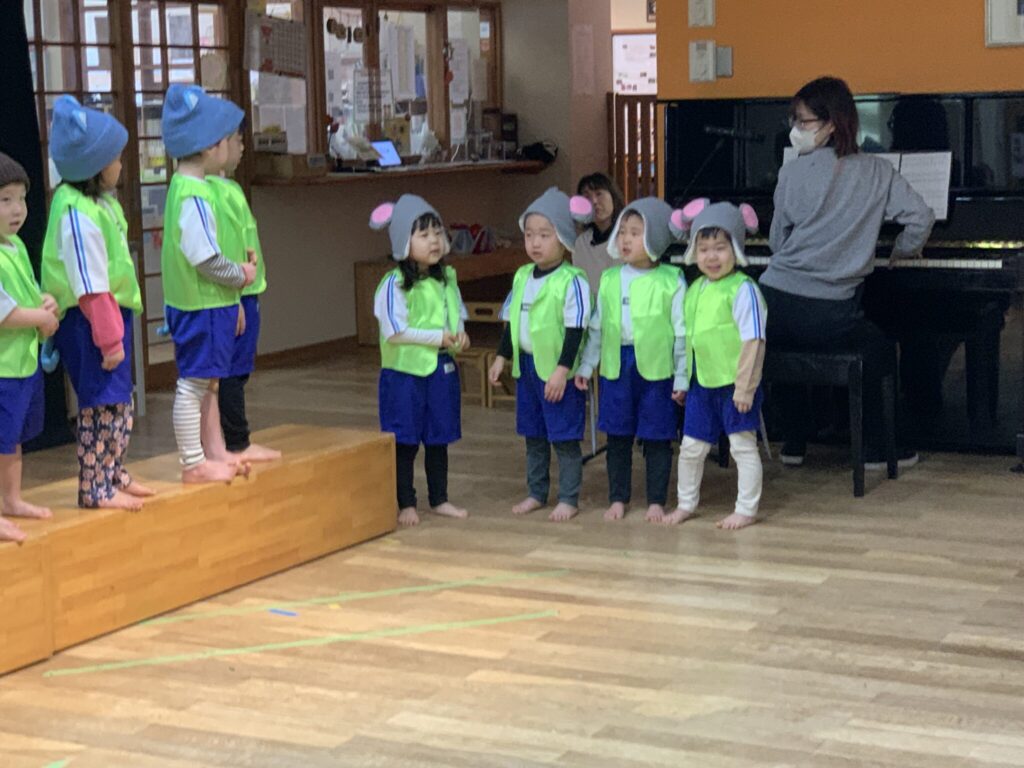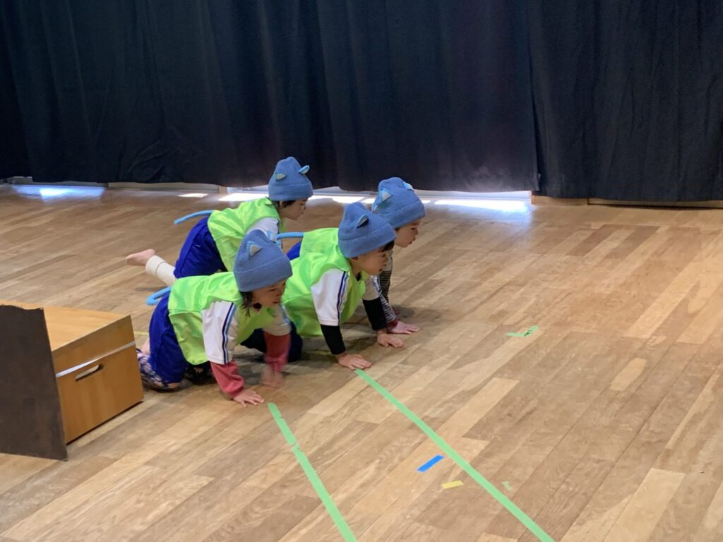 練習では、繰り返しのある分かりやすい展開を楽しみながら登場人物の動きを自分たちに考え「ネコはこうやって歩いているよ」「おじいさんはゆっくり歩いてみよう」と役になりきる姿がありました。時にはお互いに見合いっこをして「歩き方がかっこよかった」「大きな声でセリフを言えてた」「しっかり立った方がかっこいいと思う」と感想を言い合いお互いに、モチベーションを高めました😊