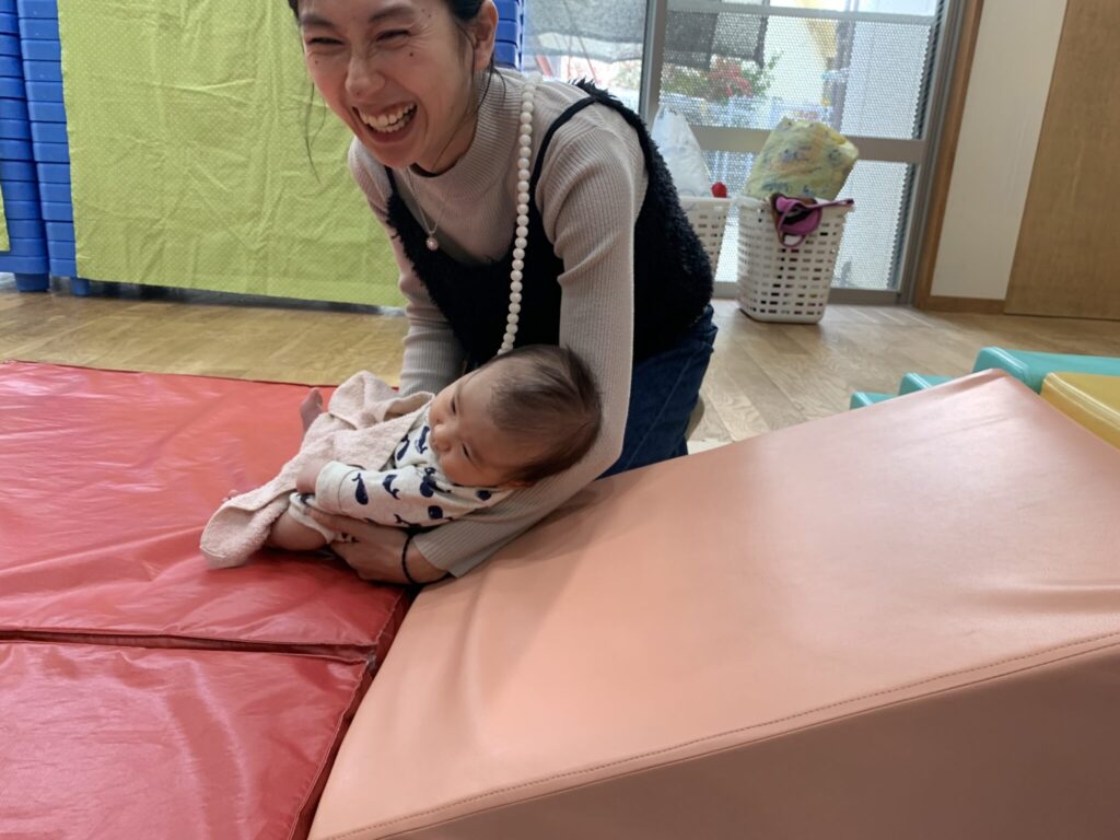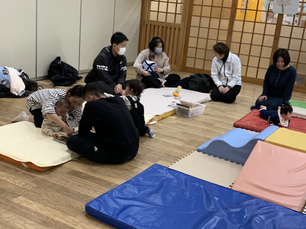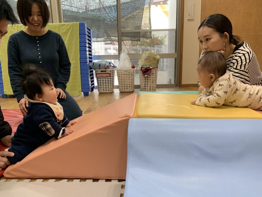 ☆4組の親子の方が遊びに来てくださいました。赤ちゃんたちは、はいはいができるようになったり、よく動くようになっていて、先月より大きく成長していました😊