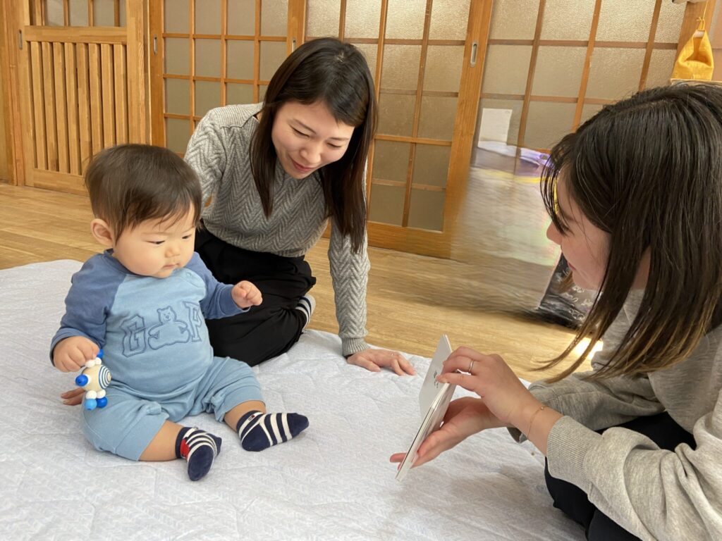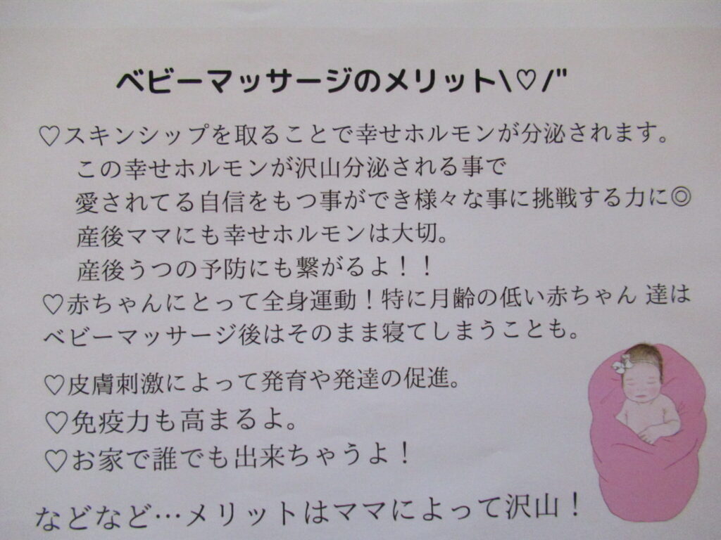 今月は、3か月~1歳4か月のお友だち9組の参加でした。足、お腹を中心にマッサージしたり、ふれあい遊びをしました。お母さん、お父さんの優しい声や表情、温かい手に心地良さそうにしている子もいましたよ😊