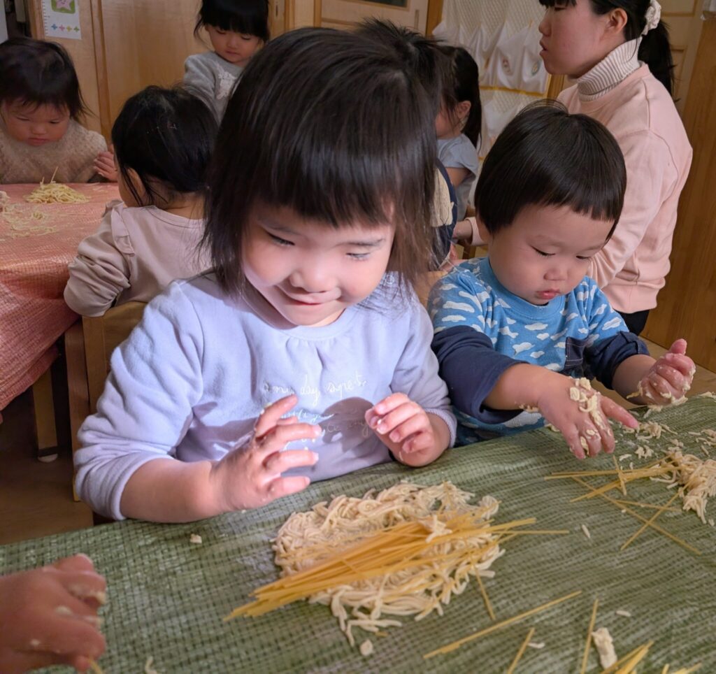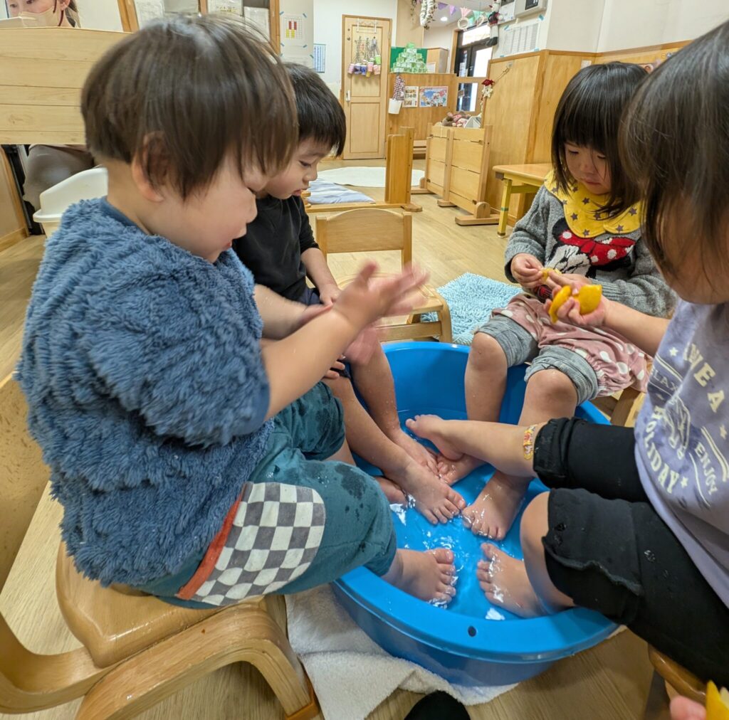 活動ブログ: 2026年 1月 神戸市小規模保育事業 なのは乳児園 > 活動ブログ > 2026年 > 1月 2025年12月1日~27日までの様子 2026年1月7日 水曜日カテゴリー: 園の取り組み 大きな葉っぱを見つけたよ。たくさん集めて嬉しそう。 「きいろいはっぱだ~!!」銀杏の葉っぱの絨毯だね。 初めてのパスタあそび。不思議な感触に夢中! きりんさんと一緒にハイポーズ!! 冬至にはみんなでゆず湯の足湯に入ったよ。爽やかないい香り。
