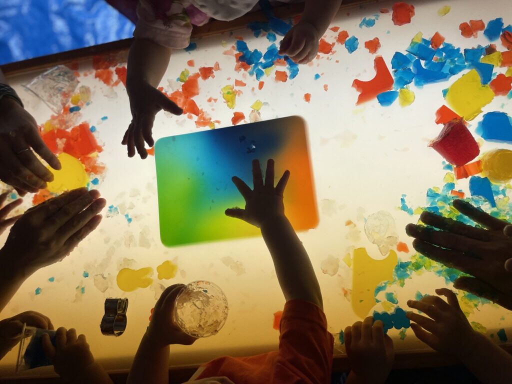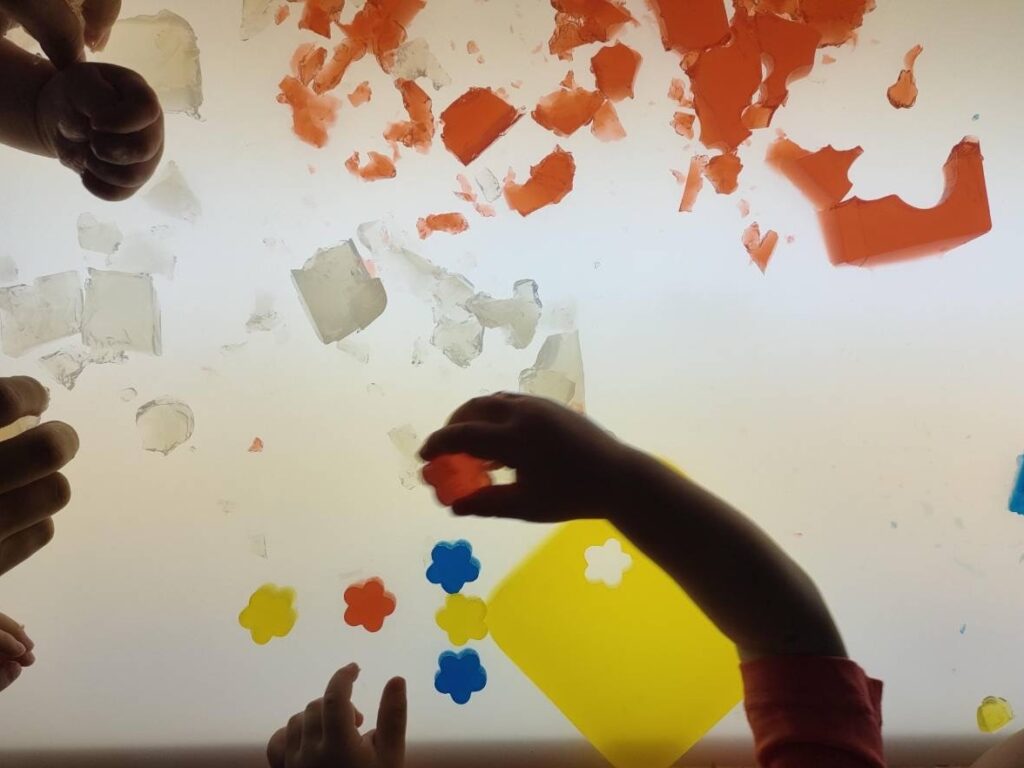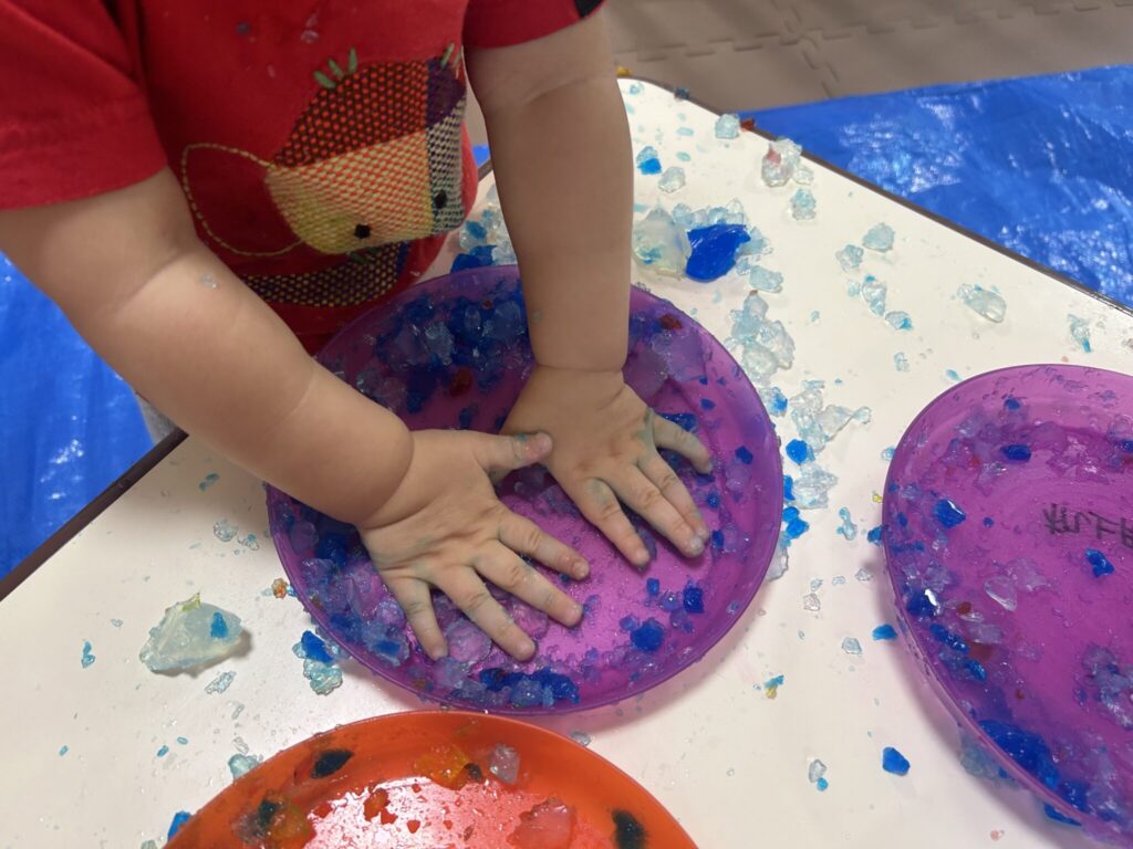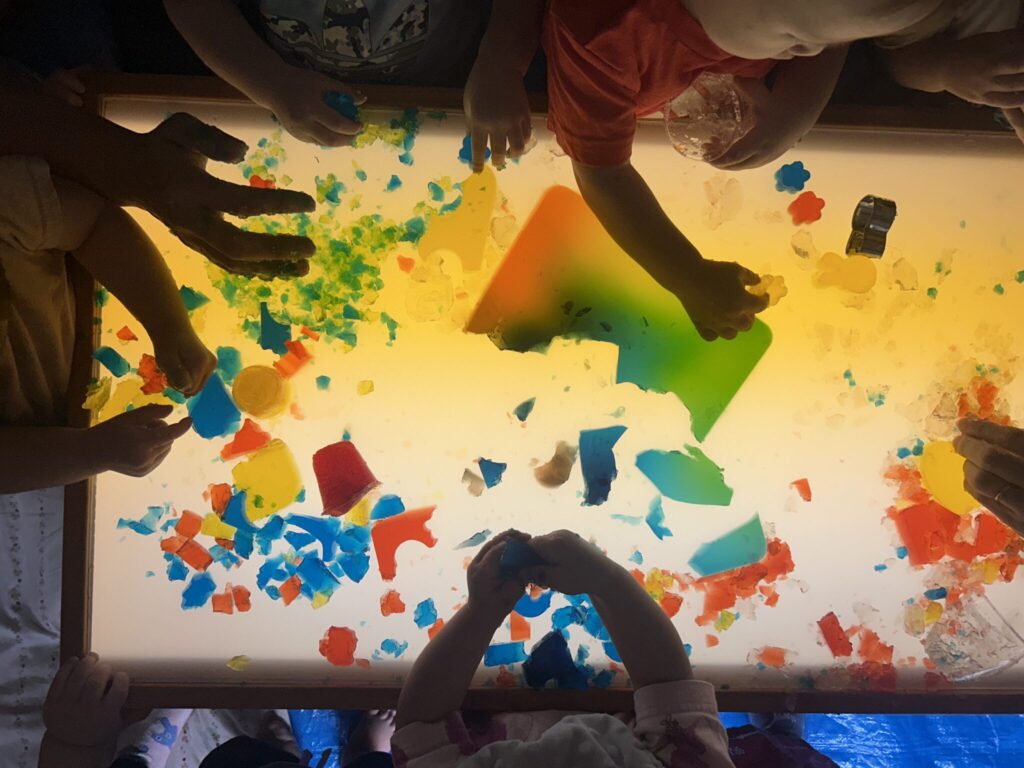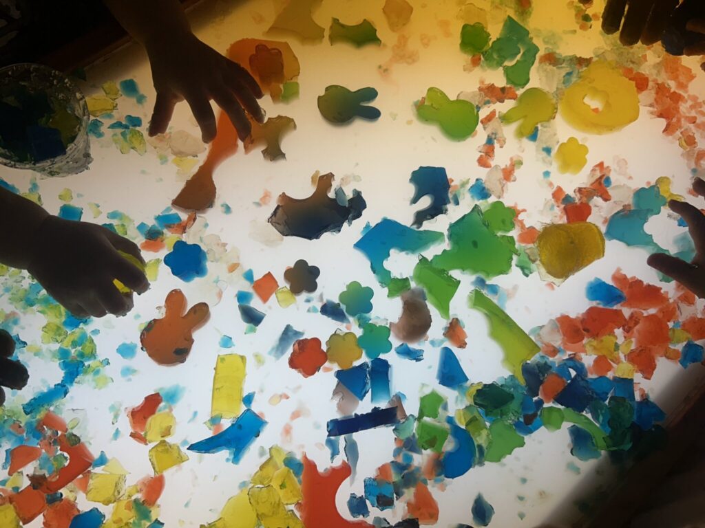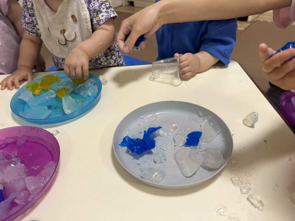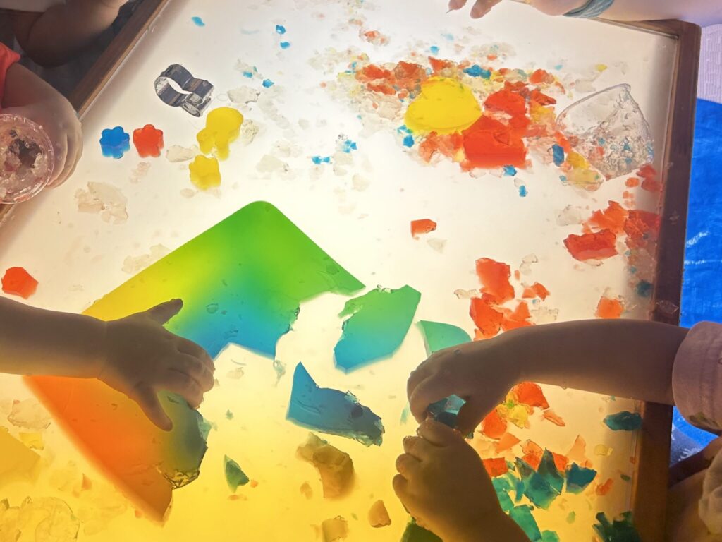 二回目は、カラフルな寒天をライトテーブルの上で触ってみました。二回目だからか、すぐにぎゅっと握って崩して混ぜて楽しむ子がたくさんいましたよ。型抜きをしたものや透明なカップも出してたくさん遊びました🌈