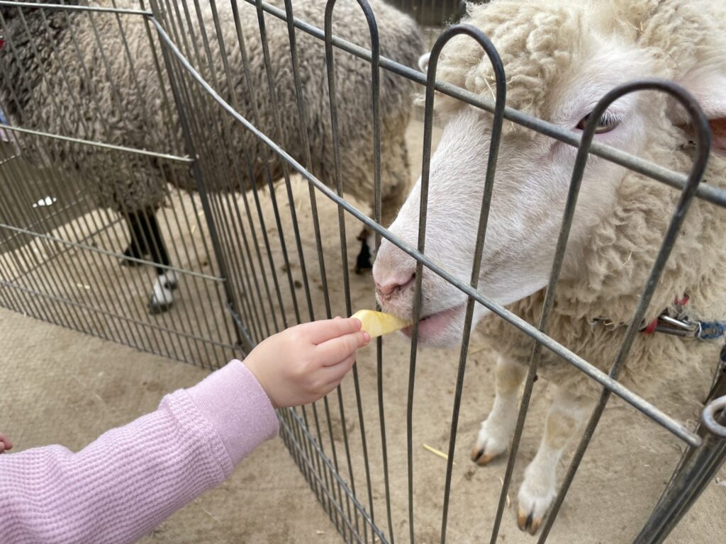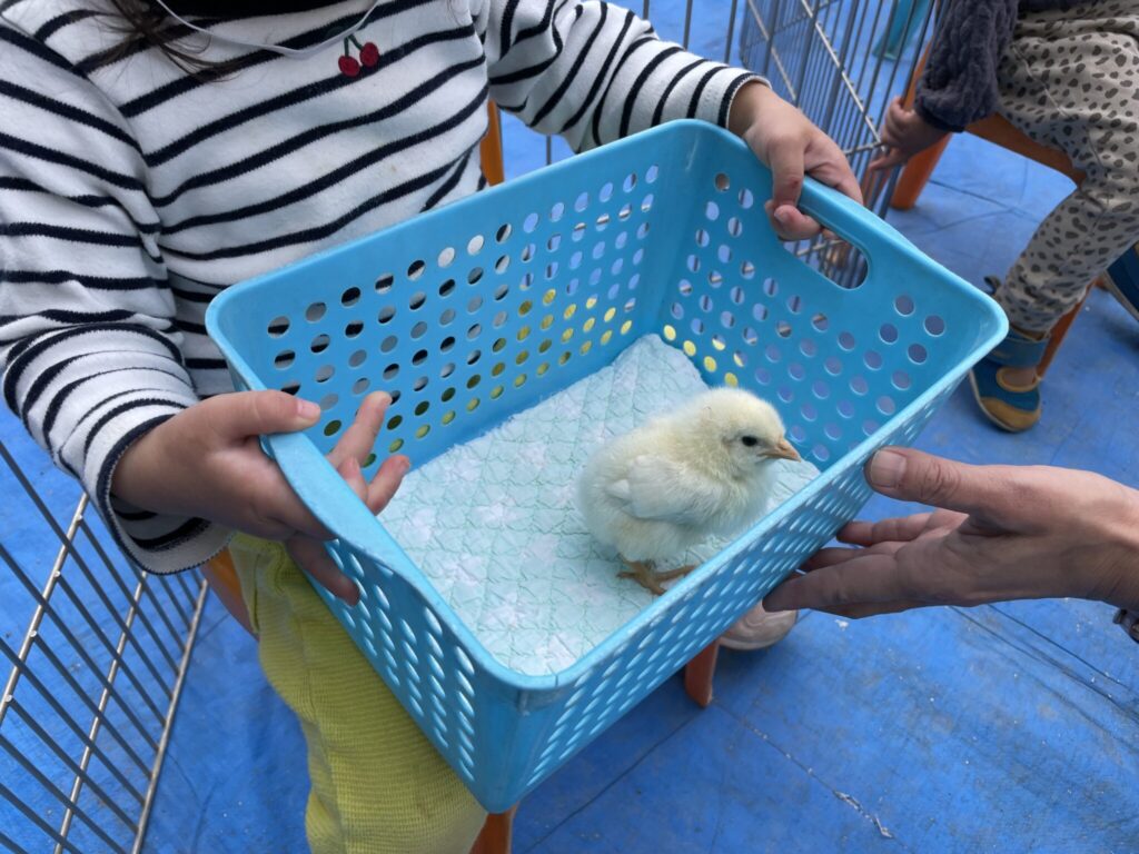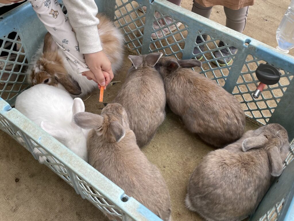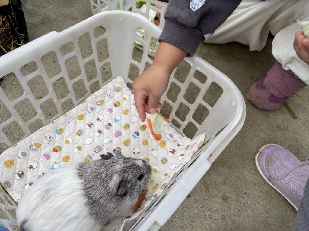 初めは少し怖がる様子もありましたが、慣れてくると動物さんをなでたり餌をあげたりと触れ合いを楽しんでいました! ひよことモルモットはカゴに入れて背中をなでなで。ヒツジやヤギなど大きな動物さんにはにんじんや葉物野菜を上手にあげていましたよ♪