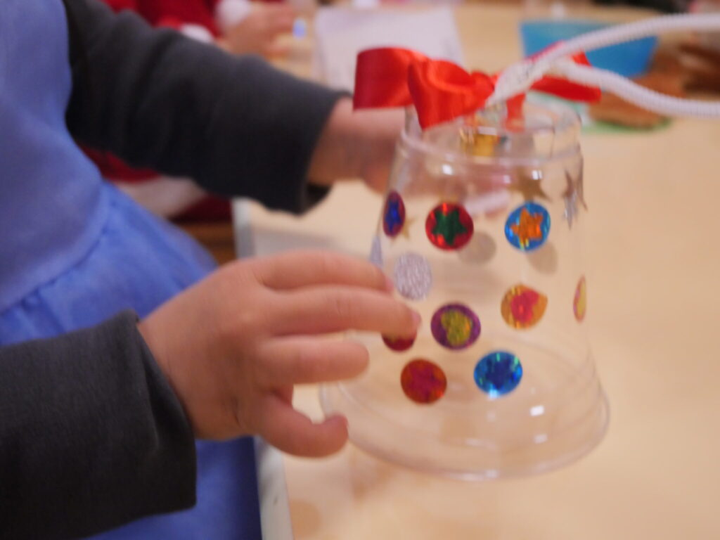 制作では、ベルづくりを行いました!プラスチックのコップに自分の好きなシールを選んで貼っていきます。「星をたくさんにしようかな~」など自分なりに考えてシールを貼っていく姿が印象的でした✨