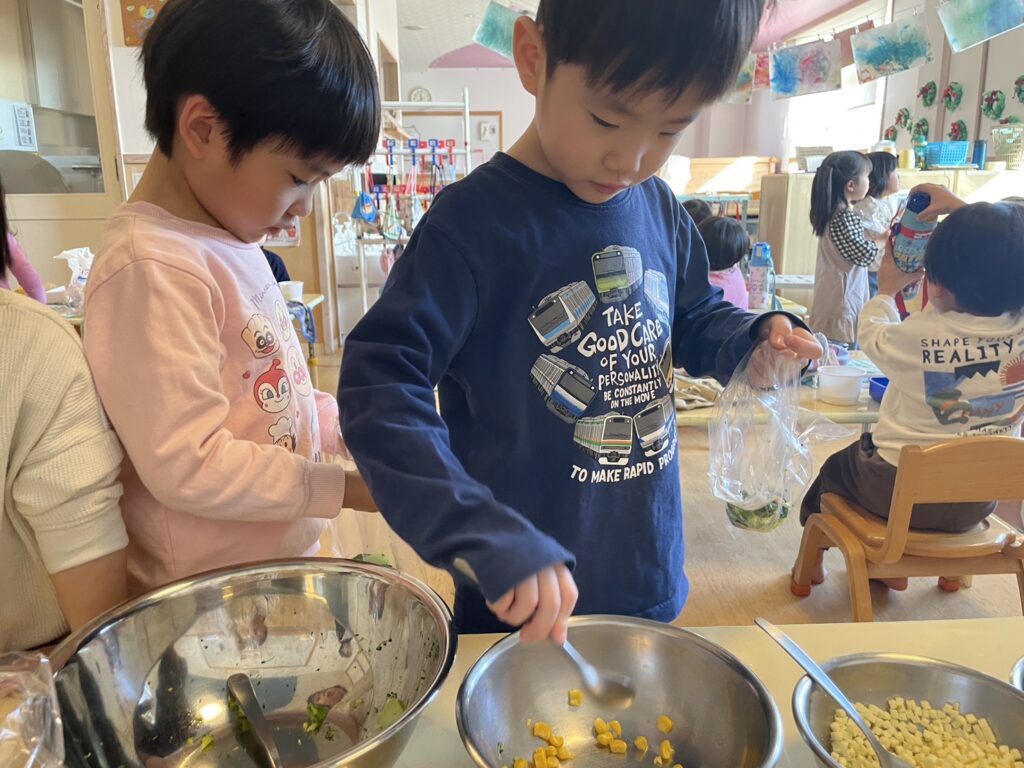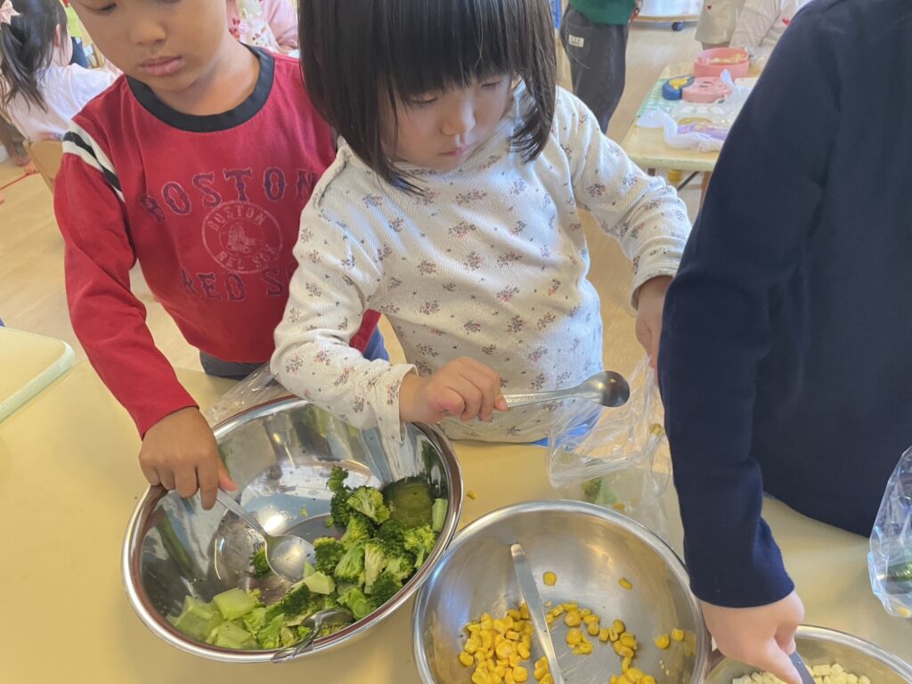 子ども達は、「私、コーンとチーズだいすきだからいっぱいいれよ!」「僕、ブロッコリー好きだから、ブロッコリーだけいれる!」と、それぞれの副菜ができあがっていきます♪