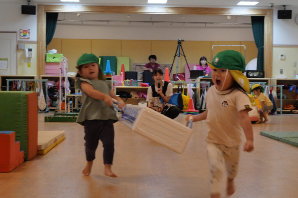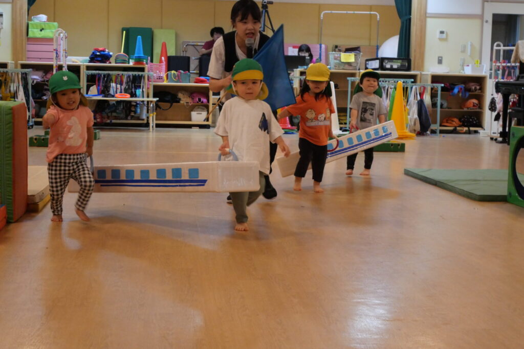 協技では、サーキットのジャンボクッションやゲームBOXを「よいしょ!」とよじ登った後は、2人で新幹線を運びます!ペアの友達が来るまで待ち、準備が整うと、ゴールに向かって「よいしょ、よいしょ」と運んでいました!