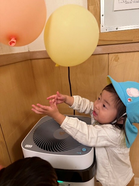 空気清浄機は、大人にとっては部屋の片隅にある何気ない存在です。しかし、子ども達はそこから吹き出る風に気づき、風を感じたり、髪の毛や風船が動くおもしろさを見つけていました。