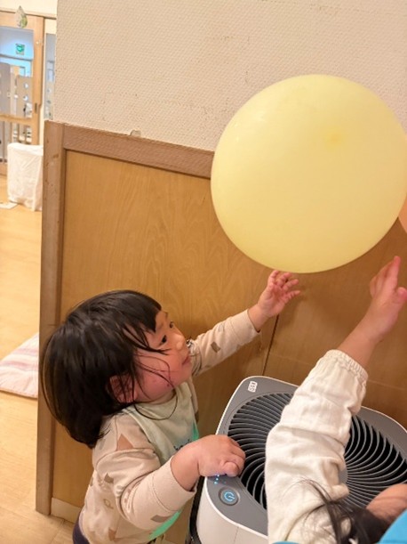 風に当たる感触や髪の毛が動く様子が楽しかったようで、何度も顔を近づけていました。やがてひとりの子が風船を持ってきて、空気清浄機の上に乗せました。すると風に乗って風船がふわりと浮き上がり、もう一人の子もにこにこしながら自分の風船を持ってきました。2人は何度も風船を乗せては、上下に揺れる動きを楽しそうに目で追っていました。