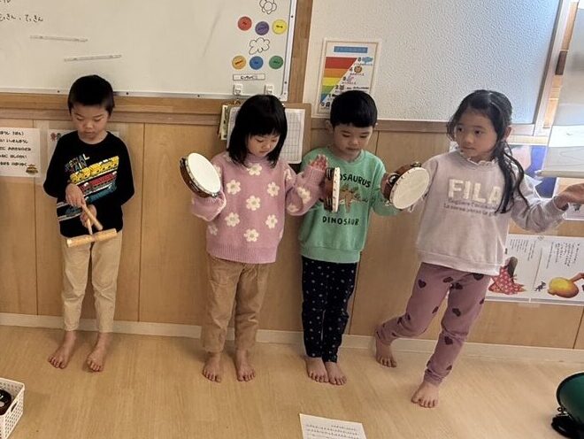 音楽遊びで一通り練習した後、給食の前にも「つっばさぐみ♪」とリズムを刻んでいたり、夕方も子ども達自ら「楽器の練習してもいい?」と提案し、意欲的に練習をしています。友達が楽器の練習をしている姿を受けて、「私もやる!」「僕も!」と次々と練習に参加する姿も見られました。