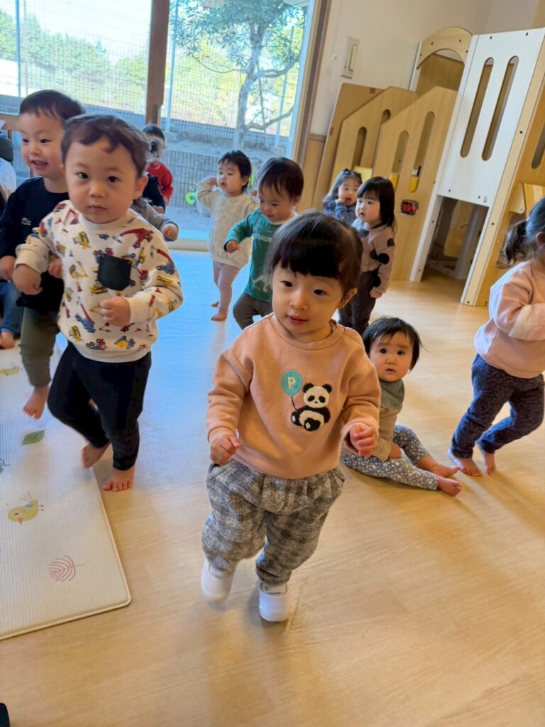 次に子ども達の大好きな“ピーピーバックします”をしました。シャケちゃんから「どこに行く?」と聞かれると「公園」「すべりだい」と声があがり、「滑り台のある公園に行こう」と目的地が決まりました。なりたい乗り物も、車・ゴミ収集車・レッカー車・救急車・スーパーアンビュランス・はしご車・ショベルカーと子ども達からたくさん声が挙がり、ずいぶん知識が増えたなと感じました。ゴミ収集車ではゴミを拾い、レッカー車では車を繋げるなど特徴のあるアクションが特に気に入ったようで、繰り返し楽しんでいました。最後は、“おばけさんぽ”をしました。部屋の電気が消えて「隠れて」の声が聞こえると、壁にくっついたり、床に寝そべったり思い思いの隠れ方をしていました。同じ曲や言葉でもそれぞれの動き方があって面白いなと思いました。