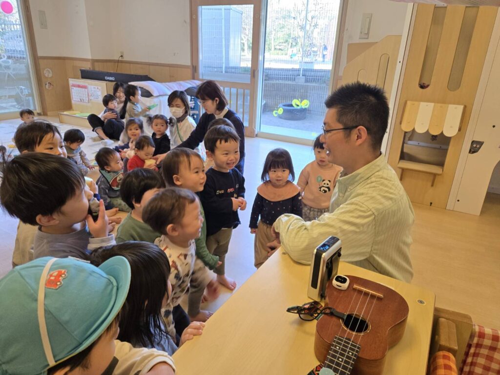 4回目のシャケちゃんLIVEがありました。まずは、“ぱたぱたぽんぽん”からです。シャケちゃんの歌に合わせて地面にペタンと倒れ「起きて起きて」の声で起き上がります。だんだん起きるタイミングが早くなるのが楽しかったようで、自然と笑い声が聞こえてきました。