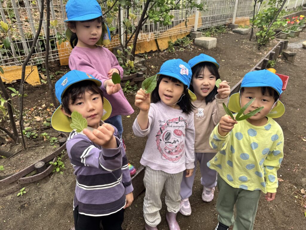 はっぱを探している時には、「おっきい!!」「こんな葉っぱもあったよ!」と色んな形や大きさの葉っぱを集めていました!