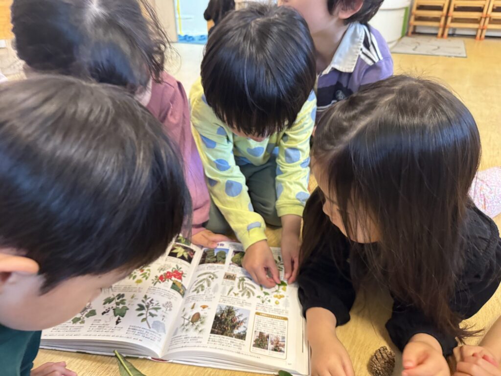 皆にも感触やの匂いを感じてもらおうと、葉っぱを画用紙に貼って掲示すると、はっぱを取りに行った子ども達は、「せっかく取った葉っぱだから…」と画用紙に貼ってある葉っぱは、”優しく触ることをルール!” 愛着を持っていました!