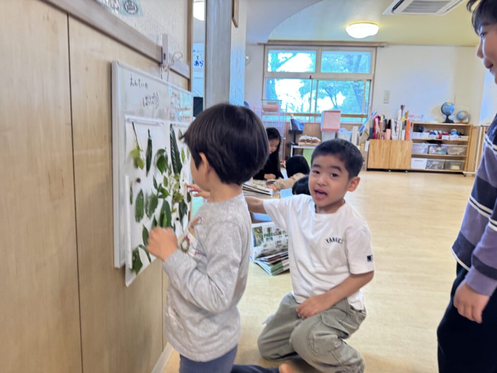 掲示されたはっぱを見て、他の子ども達は、匂いを嗅いで「くっさ!」「これ可愛い」と感想を言い合いながら見ていました!