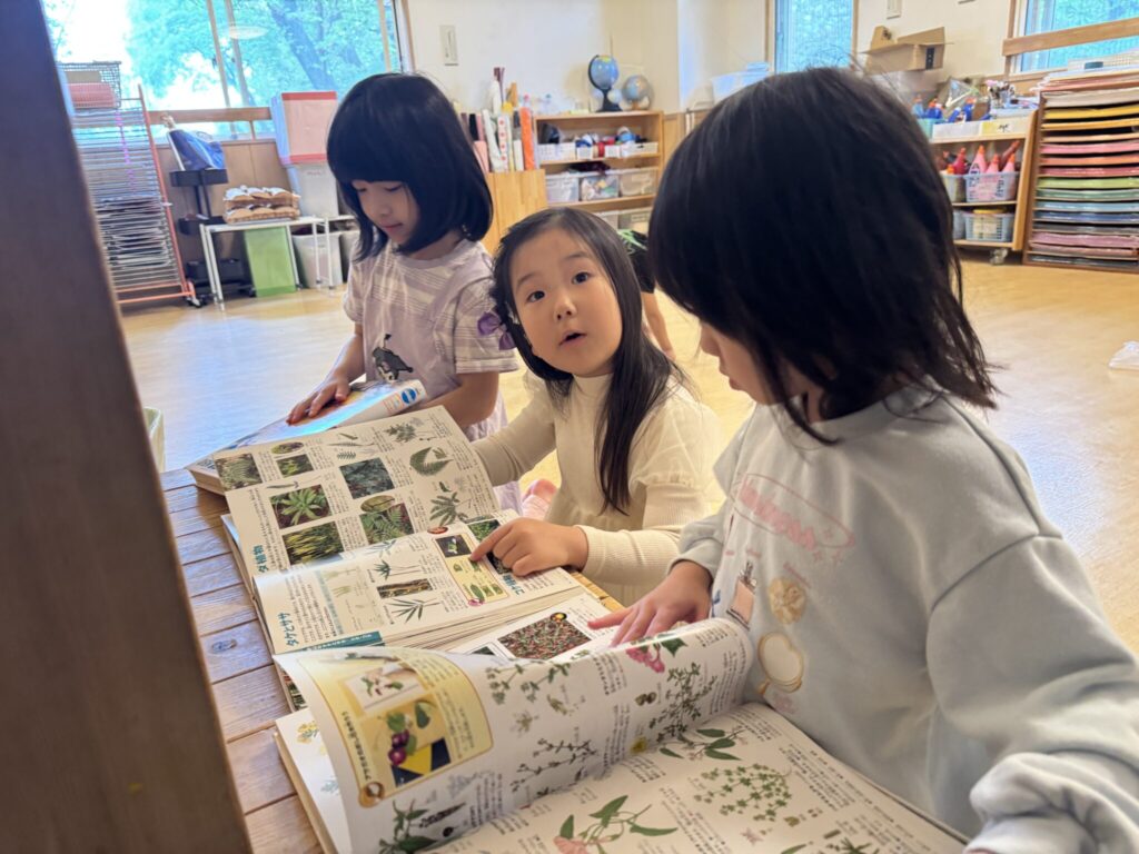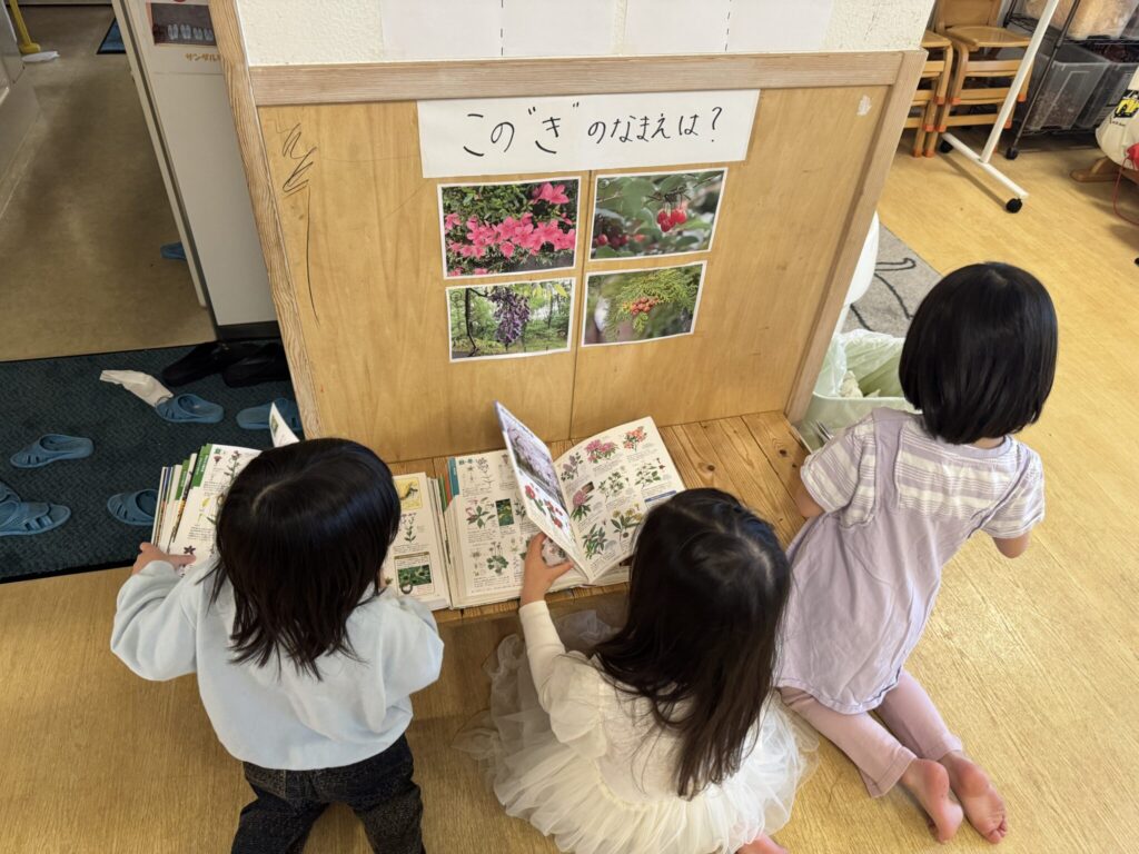 黄色の部屋には、色んな木の花の写真を掲示しています!①~④の写真の木を図鑑で調べてもらい、保育者の所に答えを言いに来ることがルールです!正解してもお友達には内緒♡自分で調べることで、木や花に興味を持ってもらえるようにしています!子ども達は正解しようと、「これか?」「こっちだよ!」と必死に図鑑でしらべていました!正解者は、別紙に名前を書いて掲載しています!紙に自分の名前を書いてもらおうと、一生懸命調べていたのが印象的です!