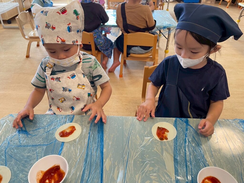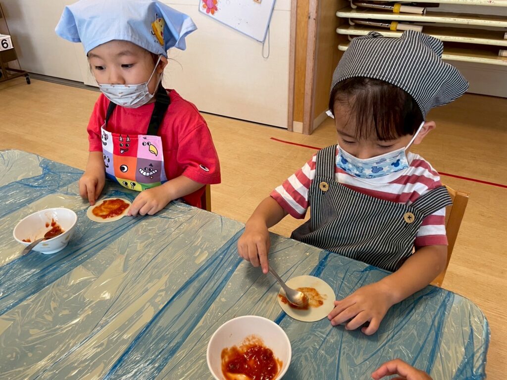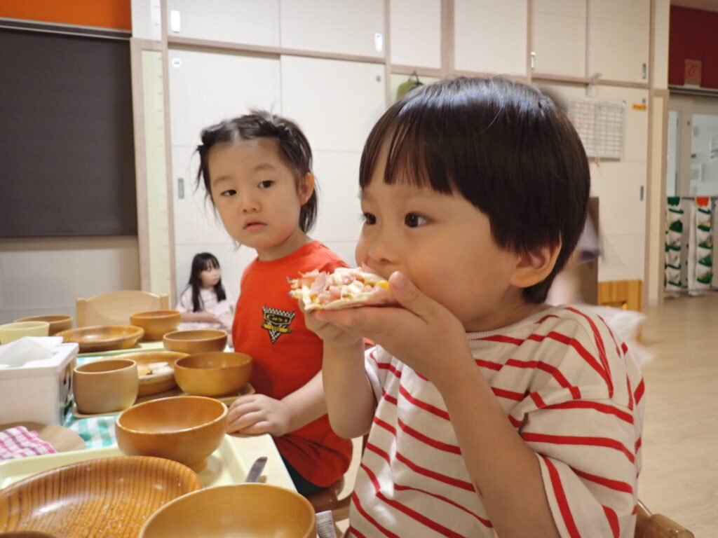 トッピングでは、ハムの並べ方にこだわりながら作っている子やナスやチーズをたっぷり入れすぎて餃子の皮からあふれ出てしまう子(笑)などオリジナルのピザが出来上がっていきました♪さっそくピザが焼きがると「美味しい!!!」「チーズが美味しい!」「ナスいっぱいにしたんだ~」と友達同士で見せ合ったり、焼きたてピザをペロリと完食しおかわりを求めている子がいました。