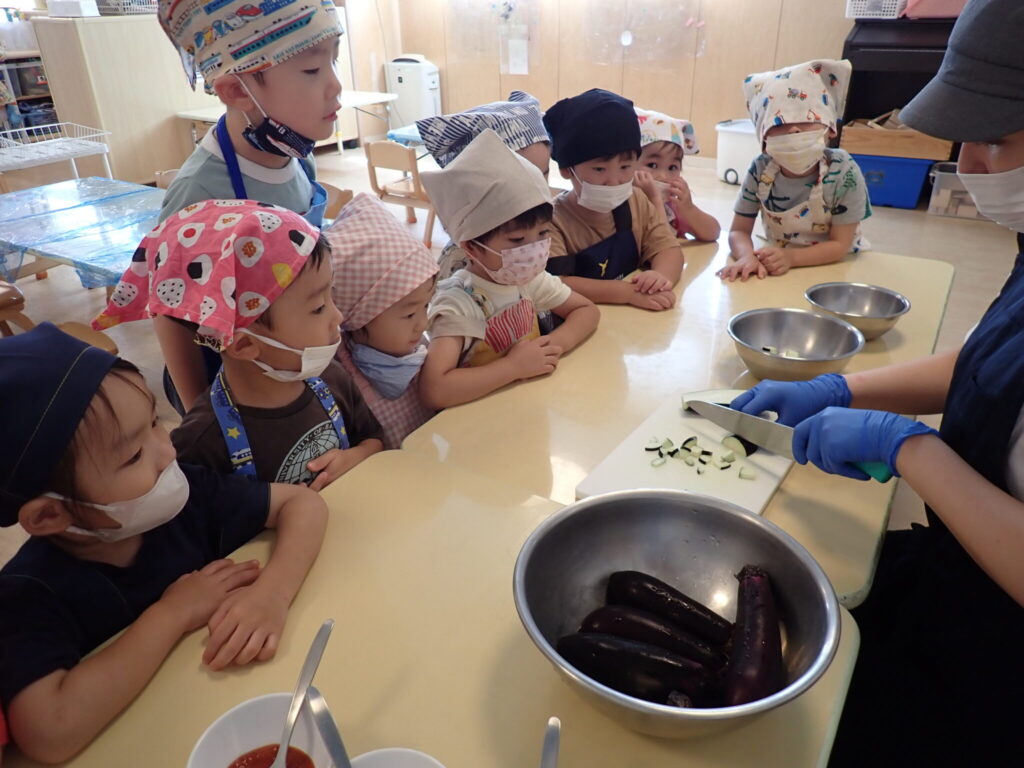 ナスの切り方やハムの切り方を近くで見た子ども達は「ナス切れた!」「すごい!小さくなった!」と見たことを次々に話しています。