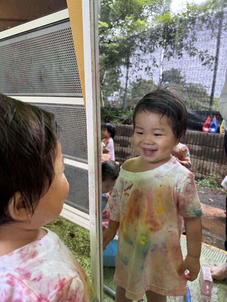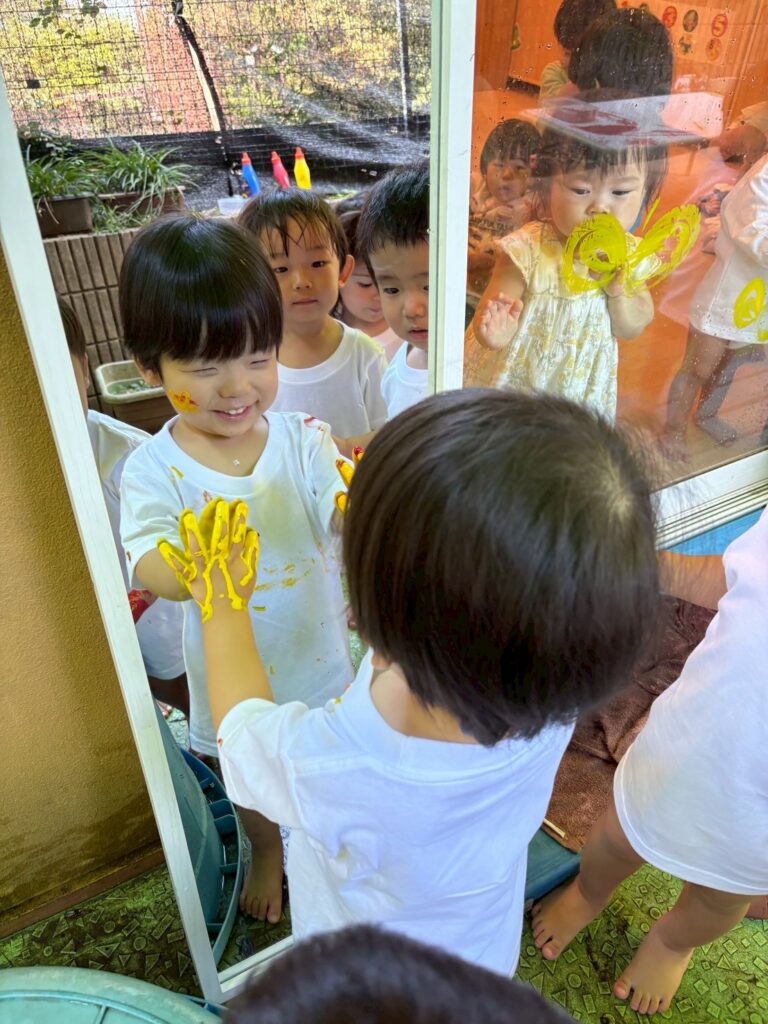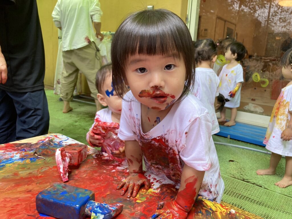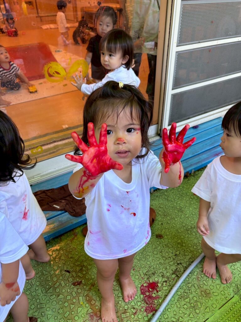 おひさま1歳児クラスでボディペインティングを行いました!最初は指先でちょんちょんと絵の具を慎重に触っていましたが、次第にダイナミックになり、手の平全体で絵の具の感触を楽しんでいました。模造紙にスイスイと塗り広げたり、テラスの壁に指で線を書いてみたり、自分の腕や顔に色を付けてみたり、とさまざまな場所がどんどんカラフルになってきました♪