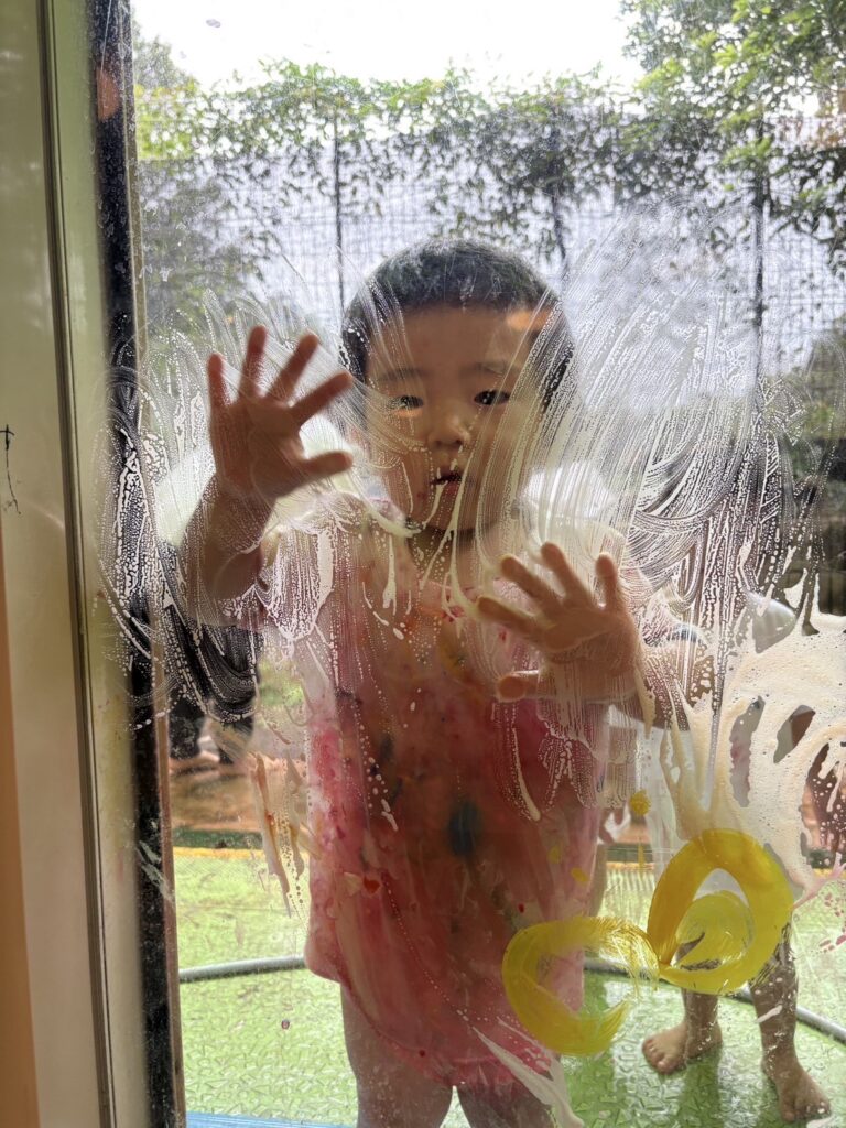 絵の具遊びの後半で泡を用意すると、ポンプから自分で泡を出し、体に付いた絵の具をごしごし落とそうとしたり、窓についた絵の具を落とそうとしてくれました。
