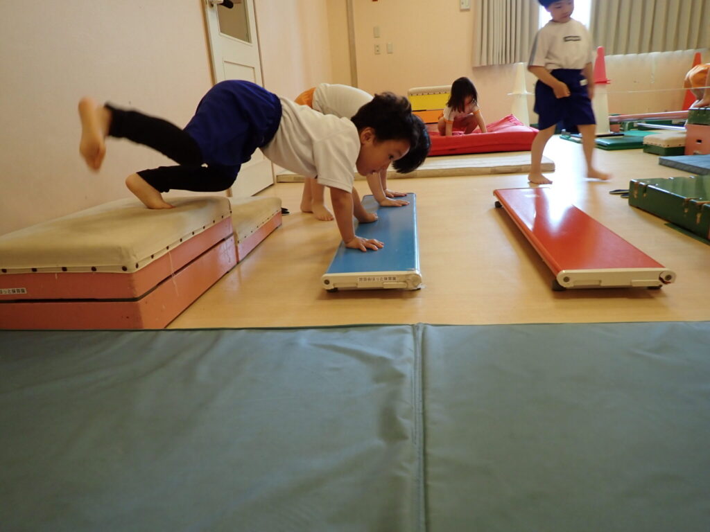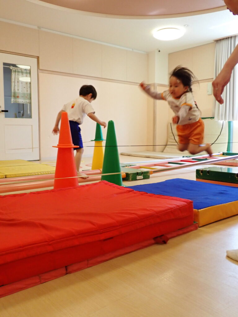 サーキットとは、色々な動き(のぼる、とぶ、わたる、よじのぼるなど)が出来るような運動遊具を繋げたコースを周回し、動きたい欲求を存分に満たせる遊びです。設定したコースは、時間内で変化します。そうすることで子ども達が多くの動作(動詞)を経験するとともに、“ずっとやっていたい!”と思うような仕組みになっています。
