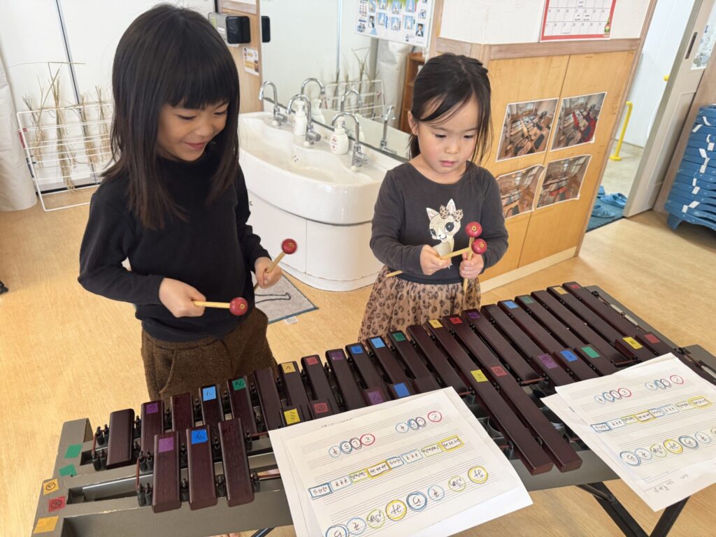 音楽遊びで一通り練習した後、給食の前にも「つっばさぐみ♪」とリズムを刻んでいたり、夕方も子ども達自ら「楽器の練習してもいい?」と提案し、意欲的に練習をしています。友達が楽器の練習をしている姿を受けて、「私もやる!」「僕も!」と次々と練習に参加する姿も見られました。