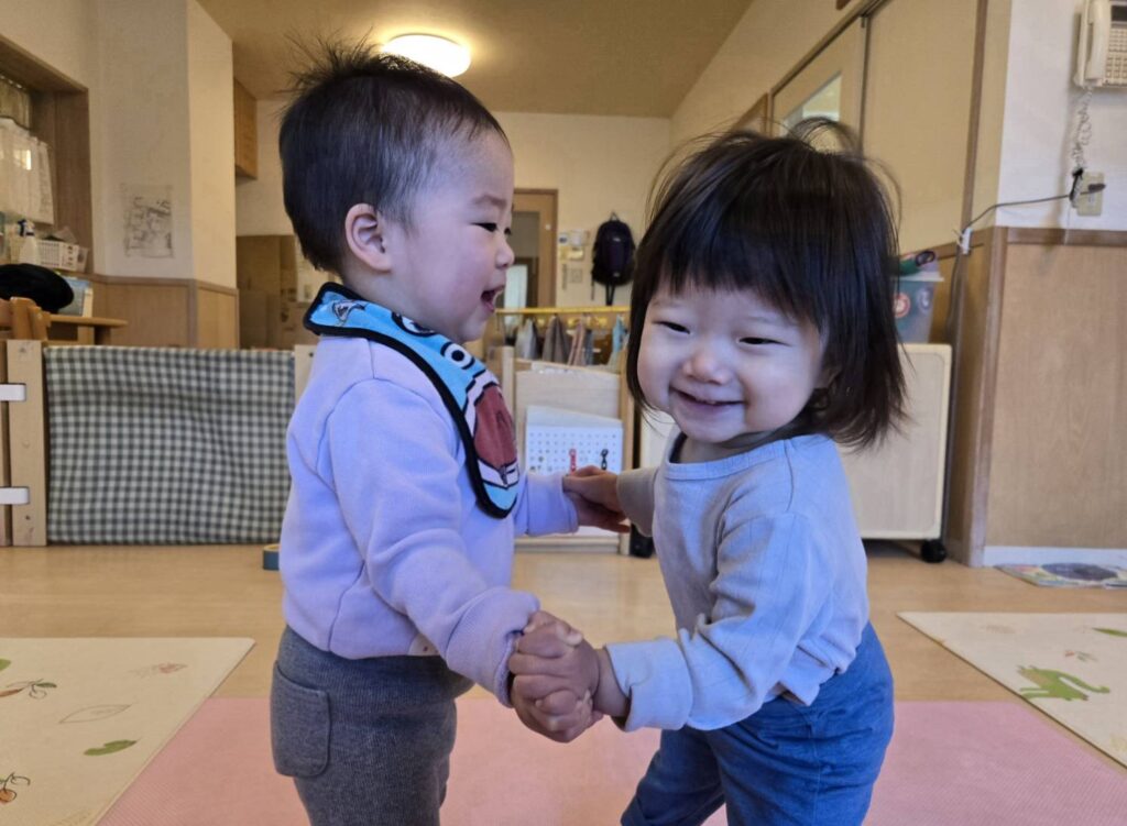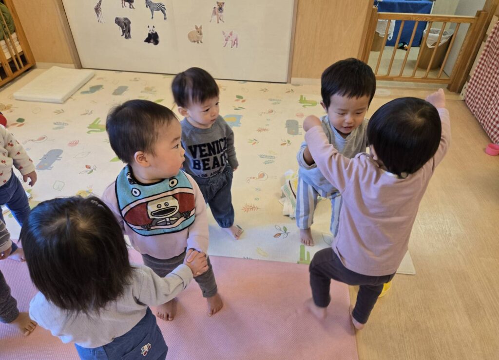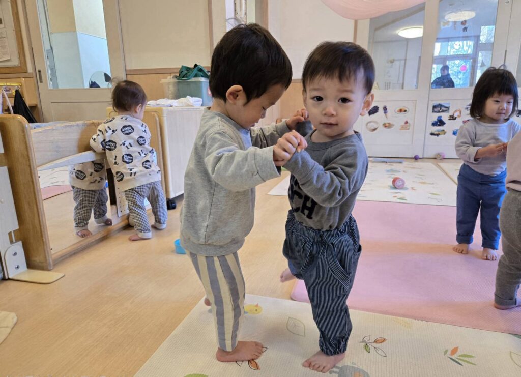 始めた頃は、保育者と二人組になって遊んでいたのですが、今ではお友だちと向かい合って両手で繋げるようになってきました。