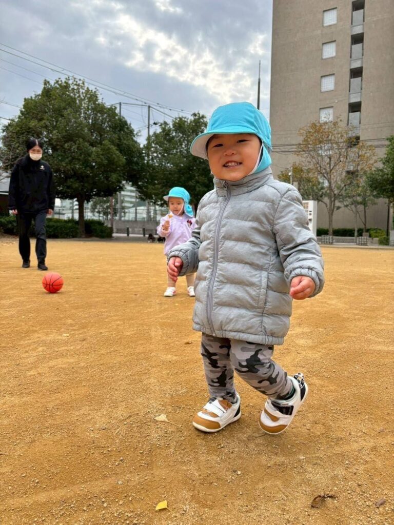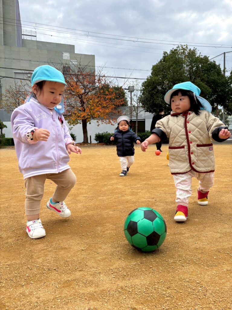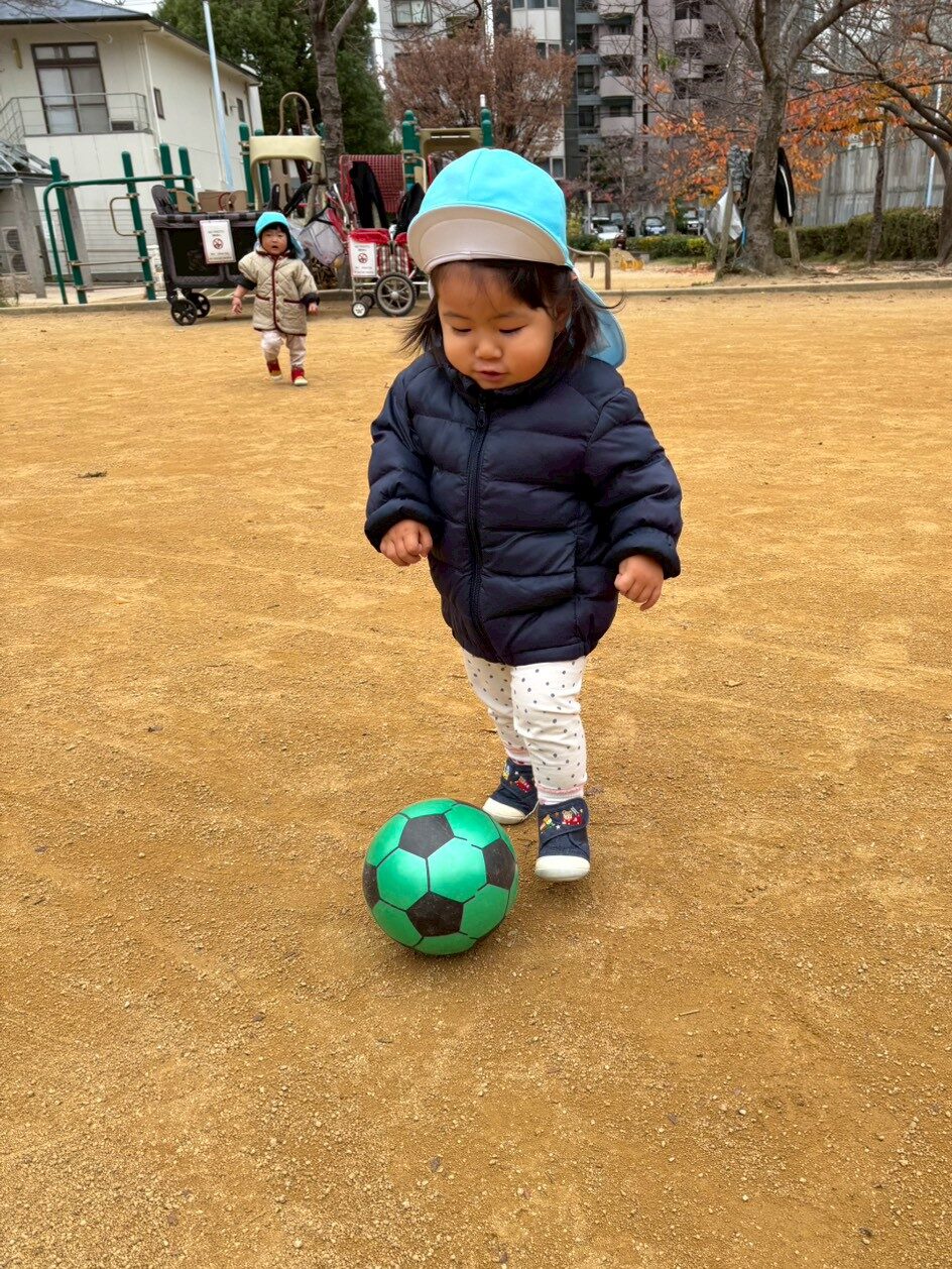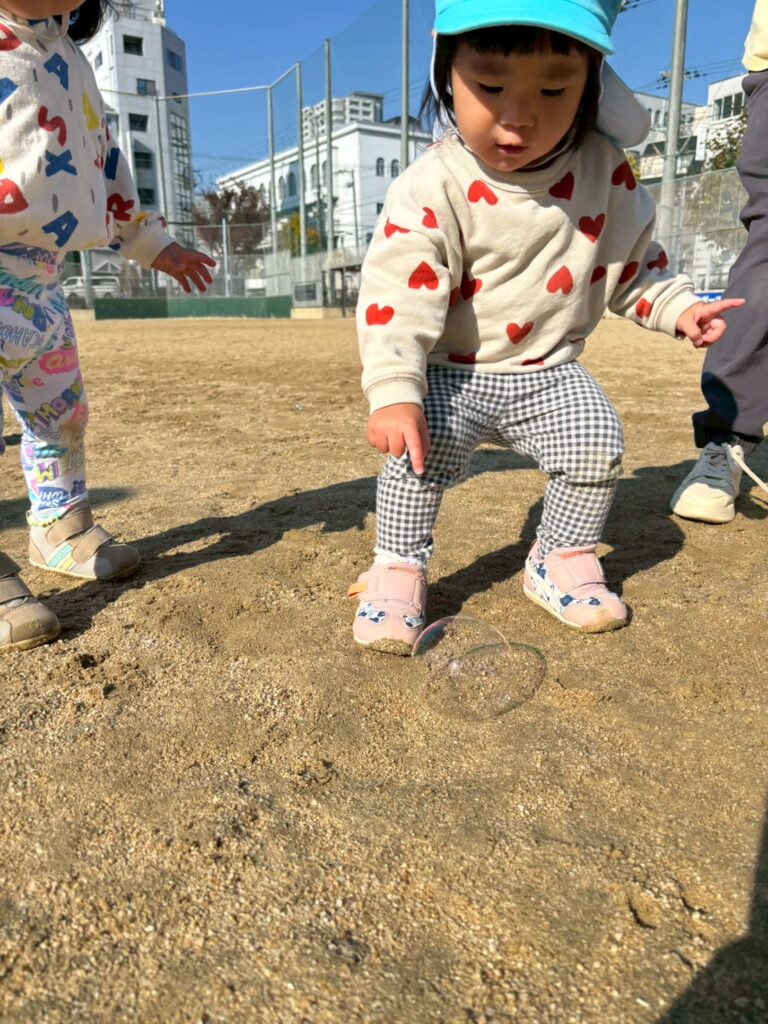 お散歩楽しいな♪ 天気の良い日は戸外でたくさん身体を動かして遊んでいます! 濡れている地面にシャボン玉がくっ付いていることに気づいて指で突っついてみたり🫧 ボールを投げては追いかけてを繰り返したり🥎 寒さに負けず、元気いっぱいの子どもたちです😊 2025年12月19日 金曜日 カテゴリー: 園の取り組み