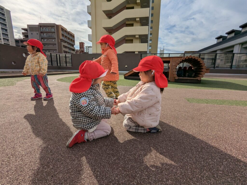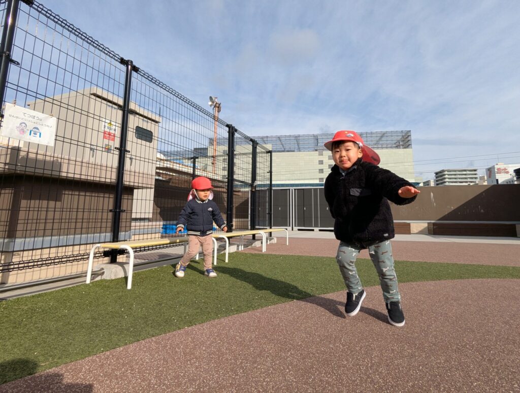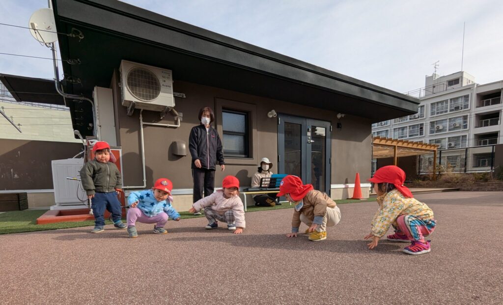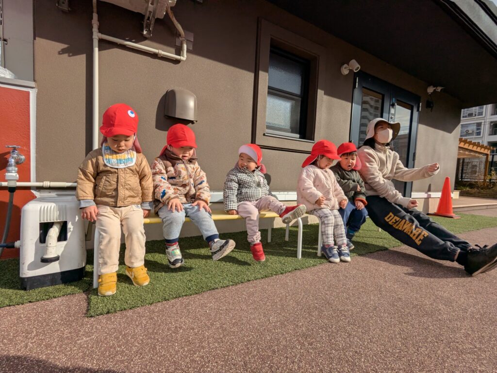 大好きリズム♪ さくらさくらんぼのリズムが大好きなもも組さん♪ 今回は屋上園庭で、リズムを楽しみました! ピアノが登場すると、「ピアノする?」と、わくわく顔の子どもたち😊 よちよち『あひる』♪ 青いお空を飛ぶ『とんぼ』 最後はお友だちとペアになって『おふね』 たくさん体を動かした後は、保育者も一緒に休憩タイム♪ 1月のちょっぴり冷たい風も心地よい、青空リズムを楽しみました。 2026年1月23日 金曜日 カテゴリー: 園の取り組み