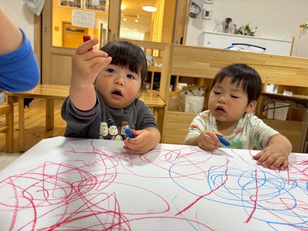 この日さくらんぼ組さんは、赤・黄・青の三原色のクレパスを使ってお絵描きをしました。