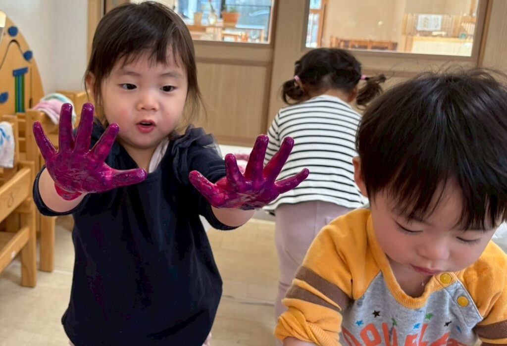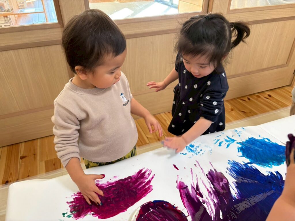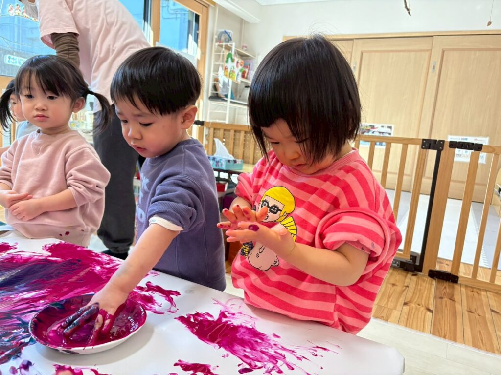 のびやかで手触りの良い水彩絵の具の感触と、きれいに染まった自分の手や模造紙の変化を楽しんでいます♪