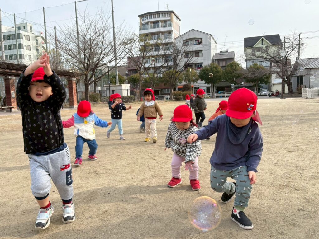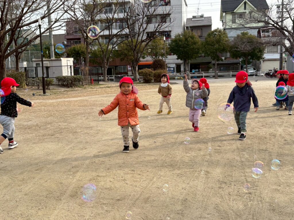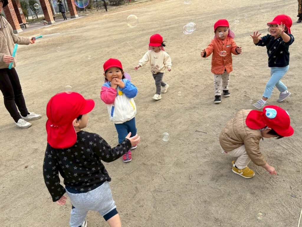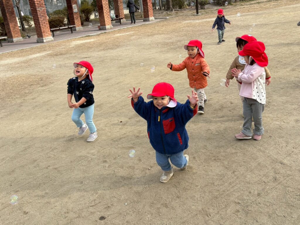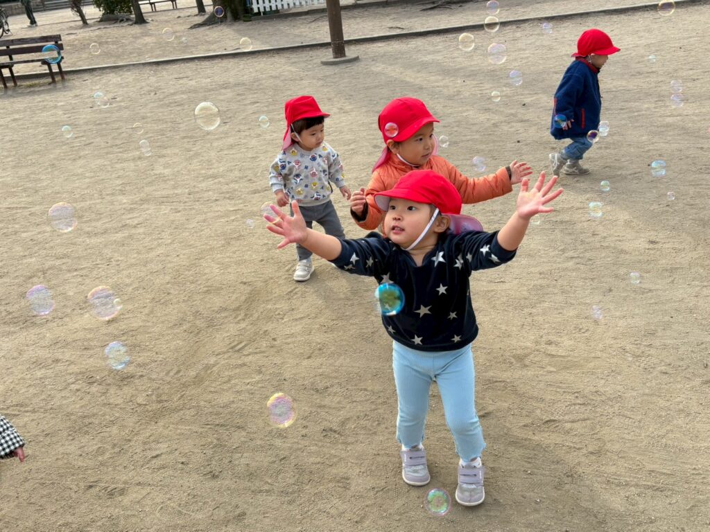 公園では、しゃぼん玉めがけて両手をいっぱいに伸ばして「まてまてー!」「つかまえた!」