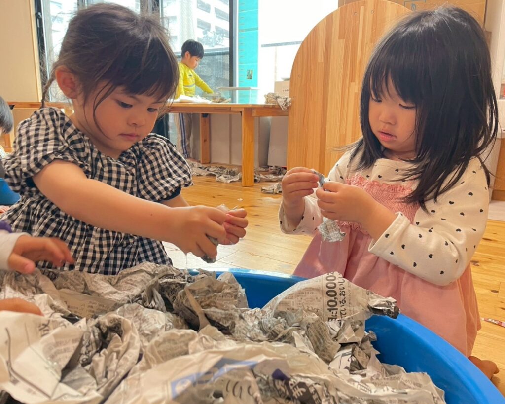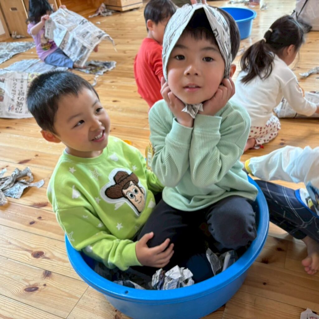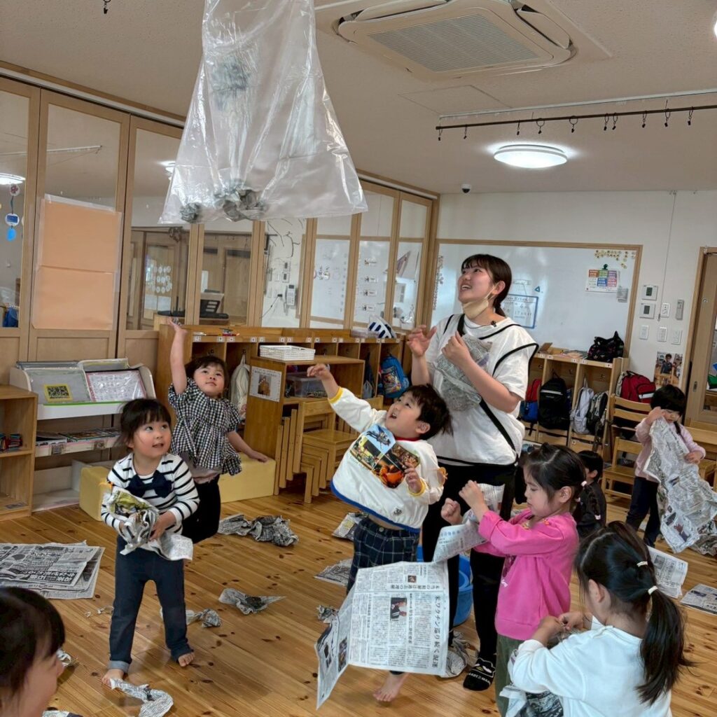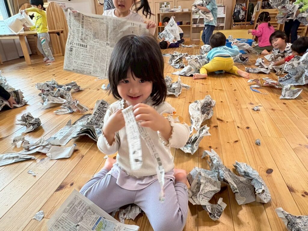 新聞紙あそび♪ 新聞紙をちぎったり、丸めて天井から吊っているビニール袋に投げ入れたり、ちぎった新聞紙を水の入ったタライに入れ、手でこねたり足で踏んだりと感触を楽しんでいました。お片付けの時には、『しんぶんニンジャ』の曲をかけ、忍者のように素早く片づけをするかわいらしい子どもたちでしたよ✨ 2026年4月17日 金曜日 カテゴリー: 園の取り組み