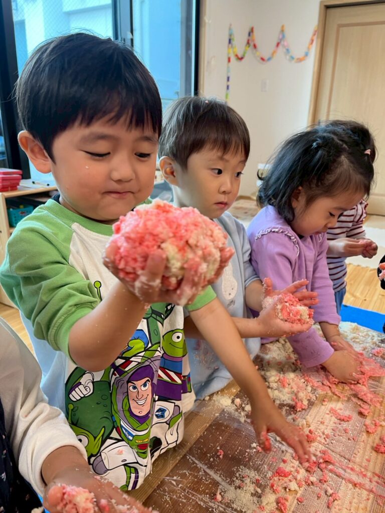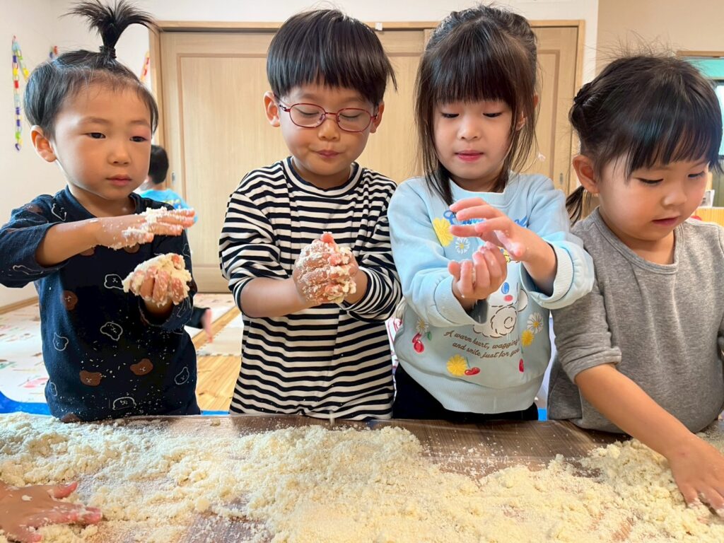 先日、ももぐみ(1歳児クラス)とゆずぐみ(2歳児クラス)で一緒に小麦粉であそびました♪
