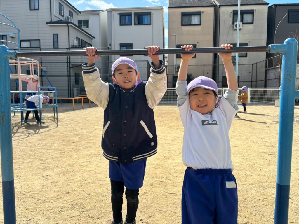 鉄棒でお友だちとぶら下がり、「何秒できるかやってみるね♡」と、数えてみたり・・